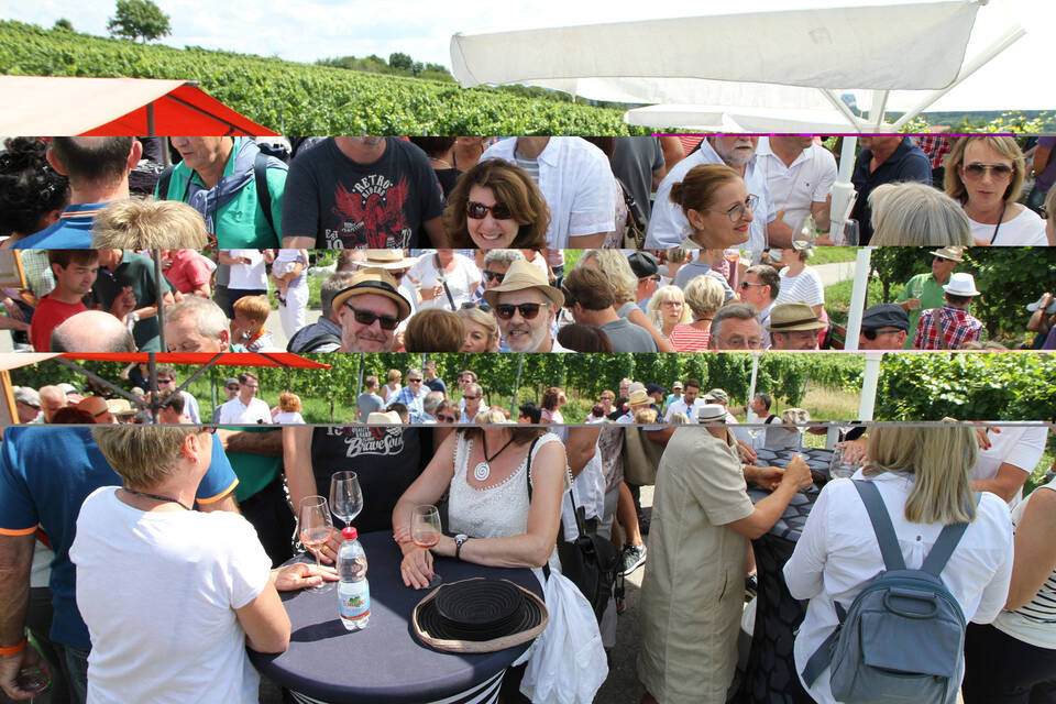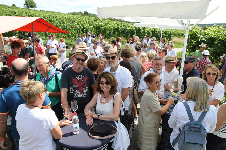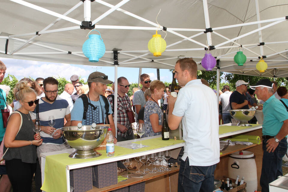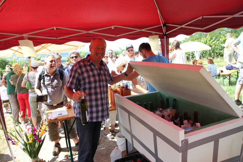 Am Stand von Weingut Fleckenstein beugt sich Manfred Fleckenstein über eine Truhe Marke Eigenbau, die mit Crash-Eis gefüllt ist und holt noch eine Flasche Secco heraus. Strom gibt es ja im Weinberg nicht. Auch er kommt mit dem Nachschub kaum hinterher. Bitte noch mehr Antipasti! Beim Weingut Hummel probiert ein Weinliebhaber einen Auxerrois. "Sehr gut, fruchtig - eine alte Rebe, die wiederentdeckt wurde", lobt er und seine Frau ergänzt: "Die Aktion ist gut für die Winzer, sie können ihren Wein präsentieren."