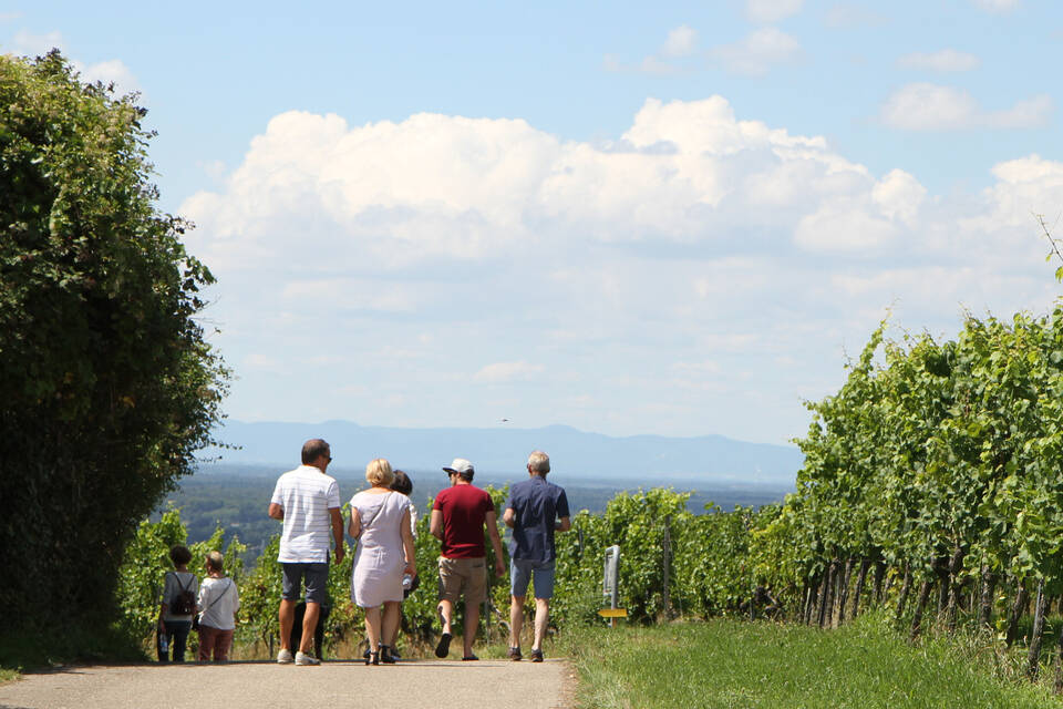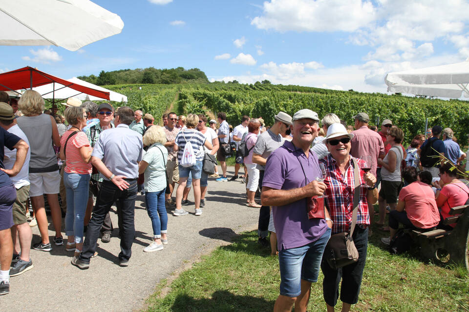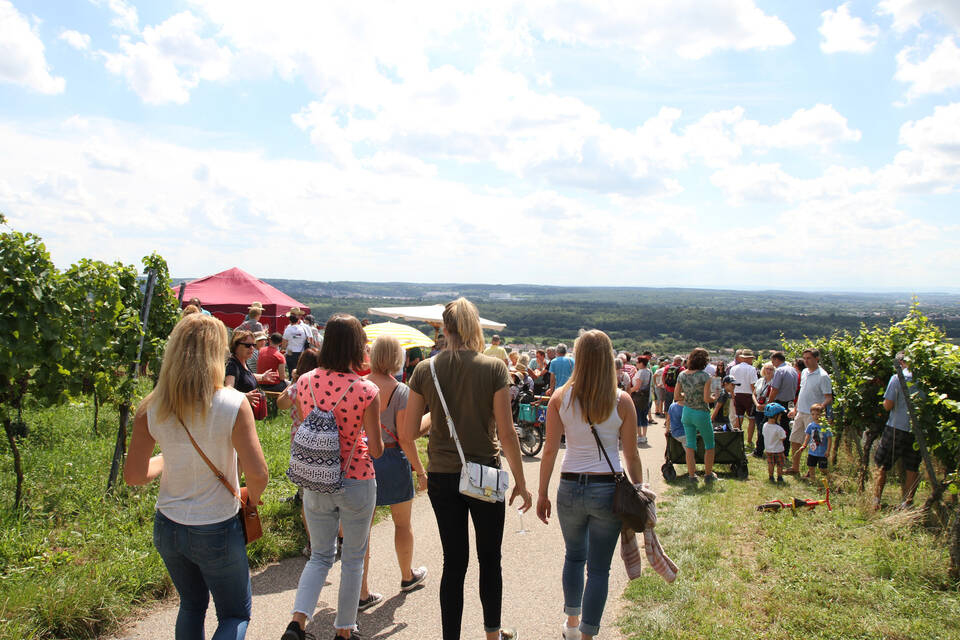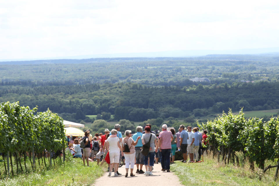Die Teilnehmer sind voll des Lobes. Das ist eine schöne Gelegenheit, die Erzeugnisse der hiesigen Winzer zu probieren und etwas von der Region zu sehen, sagt eine Dame. "Toll dass sie das angeboten haben." Und sehen lässt sich rund um den Letzenberg bei bester Fernsicht tatsächlich viel. Entlang der Bergstraße schweift der Blick zum Weißen Stein, weiter in den Odenwald mit den Windrädern, über die Hügellandschaft des Kraichgaus und die Rheinebene mit den Kühltürmen von Philippsburg, bis er sich in der lang gestreckten Silhouette des Pfälzer Waldes verliert.