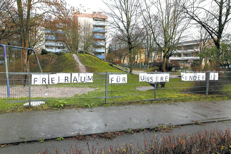 Protestbanner am Zaun: Das Gebiet an der Weinheimer Klausingstraße ist dicht besiedelt, die Bewohner hängen an ihrem Spielplatz. Foto: Kreutzer