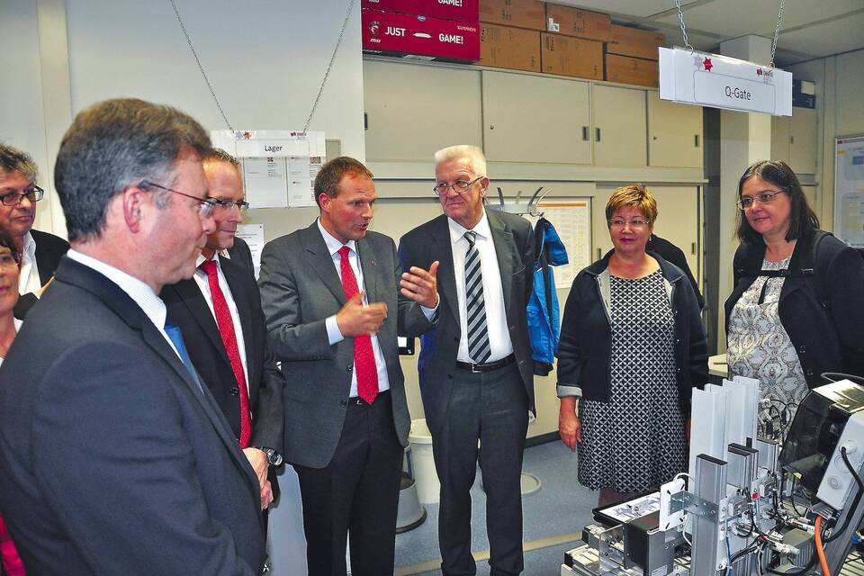 Von Professor Dr. Christian Kuhn (Elektrotechnik) ließ sich Winfried Kretschmann das neue Labor der DHBW zeigen. Der Ministerpräsident war besonders beeindruckt davon, dass Studierende verschiedener Fachrichtungen den Raum nutzen können. Foto: Benjamin Auber