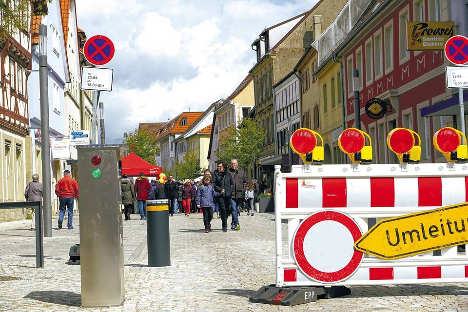Zur Fußgängerzone auf Zeit wurden Brettener Straße und Bahnhofstraße zuletzt beim Bärlauchfest im April. Damals wurde der bereits in die Straßenmitte eingebaute versenkbare Poller nicht ausgefahren - eine Absperrbarke verhinderte die Einfahrt in die Brettener Straße. Foto: Guzy