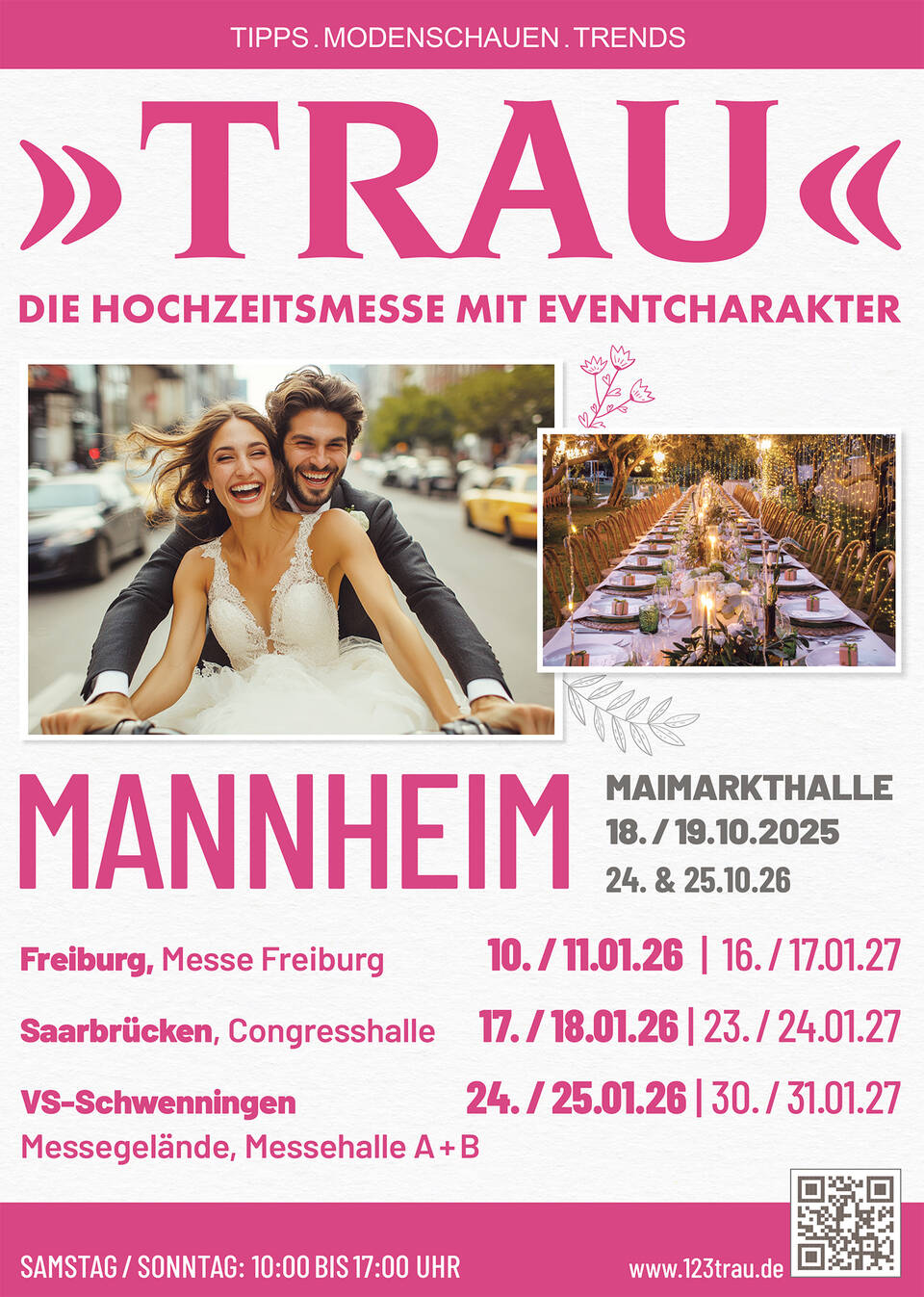 zg. Am 18. und 19. Oktober öffnet die "Trau" Hochzeitsmesse in der stimmungsvollen Maimarkthalle Mannheim jeweils von 10 bis 17 Uhr ihre Tore und lädt Brautpaare auf eine inspirierende Reise durch alle Facetten des Heiratens ein. Ob traumhafte Brautkleider, elegante Anzüge, stilvolle Dekoration oder kreative Ideen für die Traumhochzeit – renommierte Aussteller präsentieren alles, was Brautpaare für einen unvergesslichen Tag benötigen. Hier bietet sich die Chance, neueste Trends zu entdecken, Mode live bei Modenschauen zu erleben oder sich individuell beraten zu lassen.