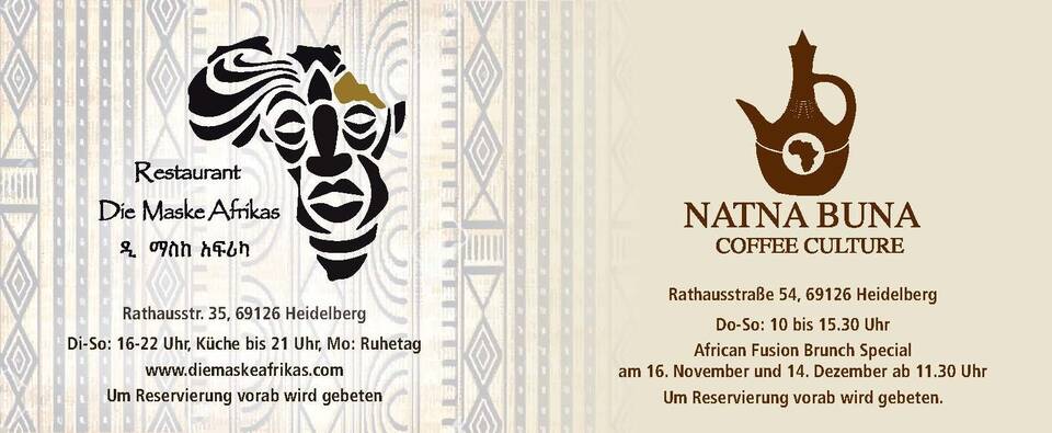 Dass das gemeinsame Essen in ihrer Heimat einen hohen Stellenwert besitzt, ist von Natalie Yacob und ihrem Vater Nugus Yacob zu erfahren: "Man nimmt sich bei uns einfach viel Zeit für einander." Und das möchten sie auch an ihre Gäste weitergeben, genauso wie den Brauch mit den Fingern beziehungsweise mit dem traditionellen Fladenbrot Injera zu essen, das dort als Besteck dient. Wie man das genau macht, erklärt die Inhaberfamilie gerne. Neben Injera als Beilage bieten sie Couscous und Fufu, einen Brei aus Maniok oder Yams mit Kochbananen, sowie auf Vorbestellung glutenfreies, aus reinem Teffmehl hergestelltes Injera. Zu den Gerichten empfiehlt Natalie Yacob südafrikanische Weine oder afrikanische Biere, die in den Geschmacksnoten Guave, Mango und Maracuja erhältlich sind und in Tongefäßen serviert werden. Eine weitere Empfehlung für die kühlere Jahreszeit: ein traditioneller Tee mit Kardamon, Nelke und Zimt oder Tee mit äthiopisch-eritreischem Ouzo sowie Honigwein, den es in Kürze geben wird! Dass sie in diesem Jahr über die Weihnachtsfeiertage geöffnet haben (Heiligabend ist allerdings geschlossen), es von 25. bis 30. Dezember eine spezielle Weihnachts-Speisekarte und am 31. Dezember ein Silvester-Menu mit Live-Trommel-Musik geben wird, verraten sie außerdem. Für Restaurant und Eventtage wird um telefonische Reservierung im Voraus unter 06221 – 3380070 oder 0152 – 53511065 gebeten.