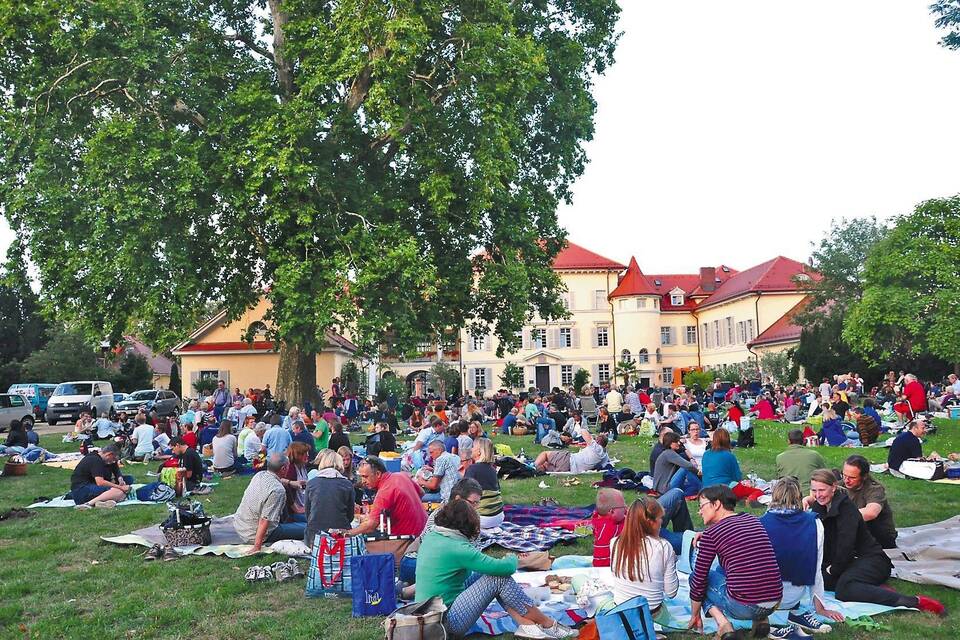 Im idyllischen Schlosshof wird gepicknickt, geredet und später auf die Leinwand geschaut. Das Organisations-Team war mit dem großen Zulauf zufrieden. Foto: Pilz