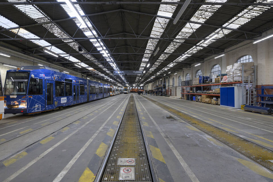 Sie müssen genauso auf dem Dach untergebracht werden wie die Schienenreinigungsfahrzeuge, die Steigerfahrzeuge für die Oberleitungen, die Fips-Fahrzeuge (Kleinbusse mit flexiblen Zielen) und Autos für die Busfahrer, die ganz früh morgens anfangen. Immerhin sollen zukünftig bis zu acht Bahnen gleichzeitig gewartet werden können, so dass theoretisch am alten Platz bis zu 75 Straßenbahnen betreut werden könnten.