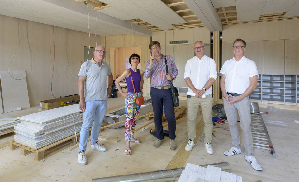 Schon im neuen Schuljahr ab September soll der Unterricht im Erweiterungsbau losgehen. Zwei Klassenzimmer werden dort aktuell auf dem einstigen Fahrradübungshof gebaut – samt einer Sanitäranlage. Erst kurz vor Ferienbeginn starteten die Bauarbeiten. Bildungsbürgermeisterin Stefanie Jansen, Hochbauamtschef Harald Heußer, Architekt Stephan Weber und Galen-Schulleiter Thomas Bischofberger waren beim Vor-Ort-Besuch abermals beeindruckt vom rasanten Baufortschritt.