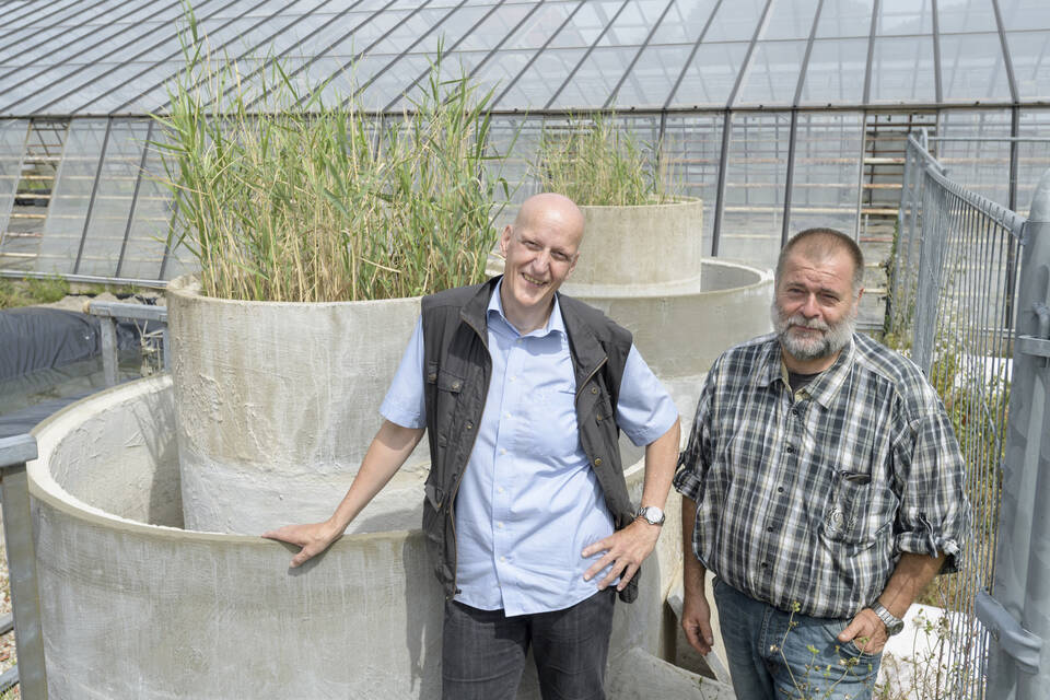 Der Leiter des Landschafts- und Forstamtes, Ernst Baader, mit dem Leiter des Regiebetriebs Gartenbau, Wolfgang Morr, vor den Testkübeln in der Stadtgärtnerei.