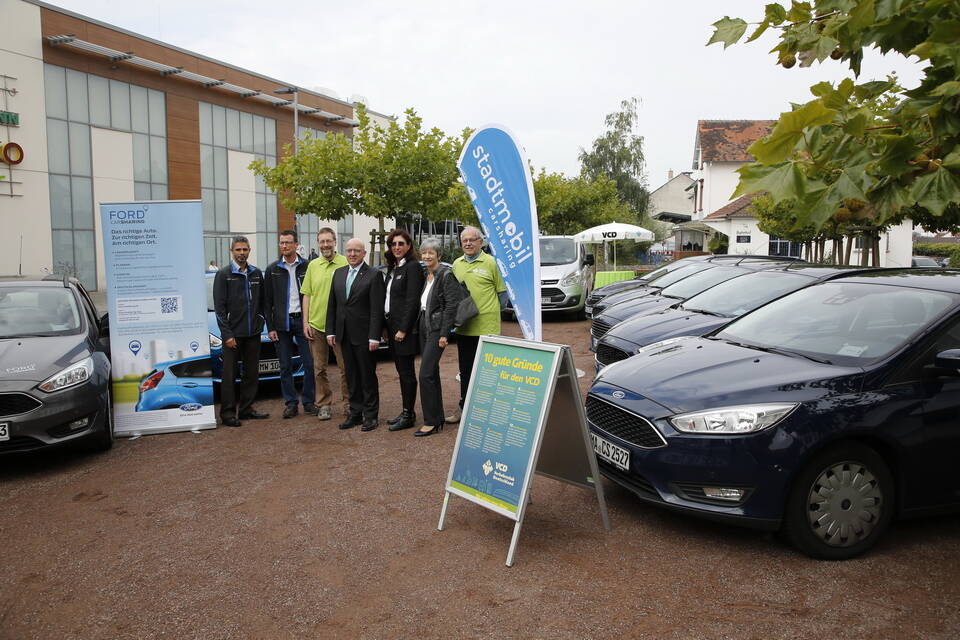 Wiesloch. (jdh) Passend zur Europäischen Mobilitätswoche unter dem Motto "Gemeinsam nutzen bringt dich weiter" präsentierte der Verkehrsclub Deutschland (VCD) stolz die in Wiesloch stationierte Carsharing-Flotte der beiden lokal aktiven Anbieter, "Ford Carsharing" und des schon vor Urzeiten aus der Initiative des VCD hervorgegangenen "Stadtmobils". Man hatte zur Mobilitätswoche eigens die Fahrzeuge der eigentlich konkurrierenden Anbieter zusammengebracht, um für die Idee des Carsharings zu werben.