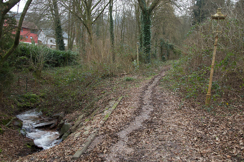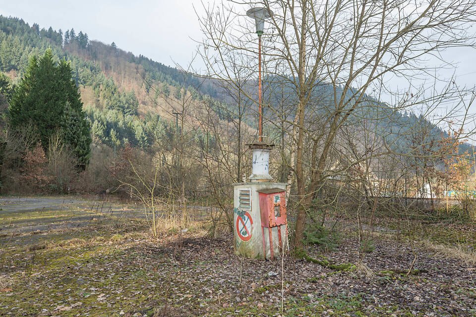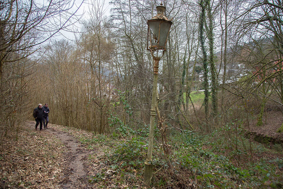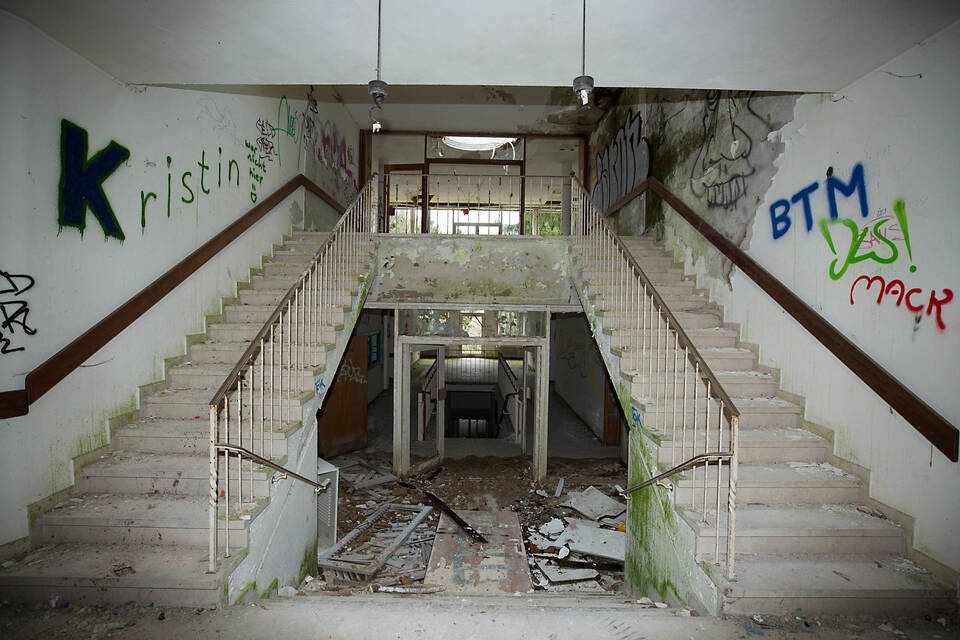 Vom Parkplatz führt ein schmaler Fußweg hinauf zu den stattlichen Gebäuden. Der Starkregen der vergangenen Wochen hat hier tiefe Furchen hinterlassen. Ein umgestürzter Baum blockiert den Weg. Die schmucken Laternen lassen den früheren Glanz des Areals noch erahnen, die Glaseinsätze sind jedoch alle zerstört. Wie aus dem Nichts erheben sich plötzlich die Gebäude. Stellenweise wuchert das Efeu über die Fassade bis zum Dach. Man glaubt es kaum: Kein einziges Fenster ist mehr ganz.
