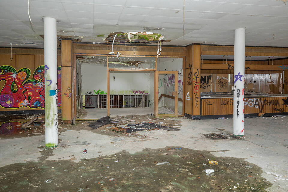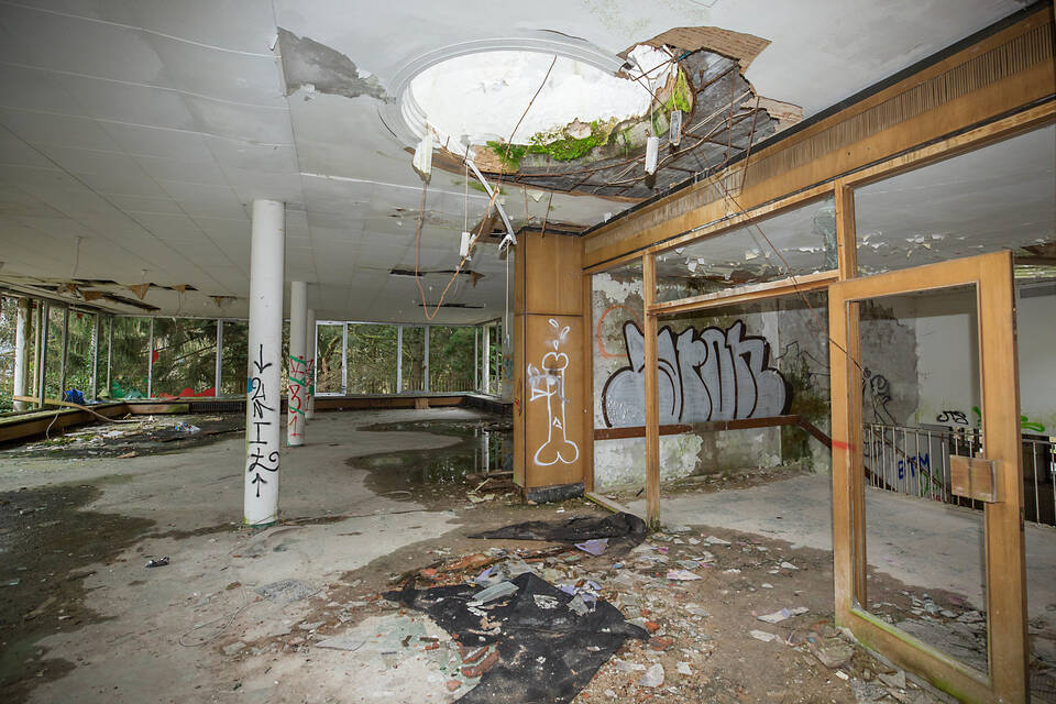 In den Seitenflügeln des U-förmigen Hauptgebäudes sieht es so aus, als wäre die Zeit stehen geblieben und die letzten Senioren wären gerade erst ausgezogen. An den Türen stehen noch die Namen der früheren Bewohner. Die Pflegebetten hat "Pro Seniore" aber ausräumen lassen. Hier offenbart sich auch, warum das Pflegeheim kurz vor der Jahrtausendwende keine Zukunft mehr hatte: Auf den Zweibettzimmern gab es nur Waschbecken und keine Toiletten. Eine Verschärfung der Gesetze bedeutete das endgültige Aus.