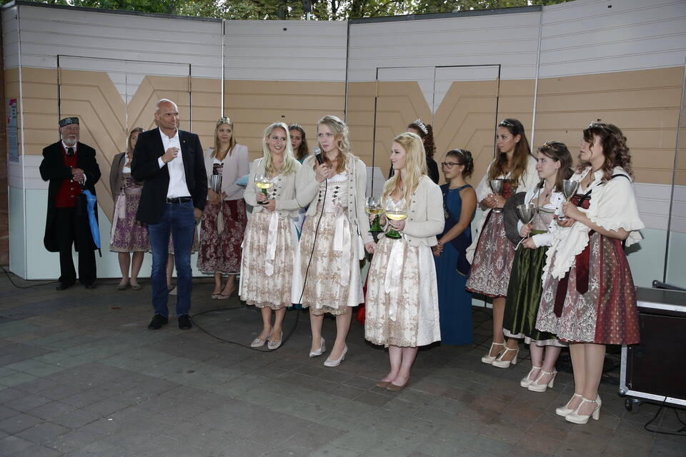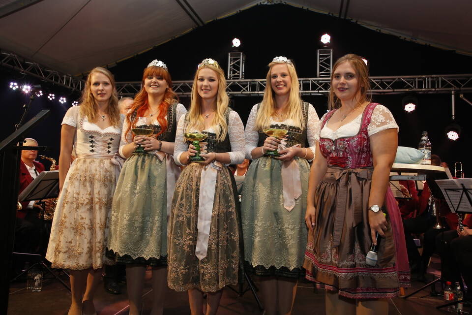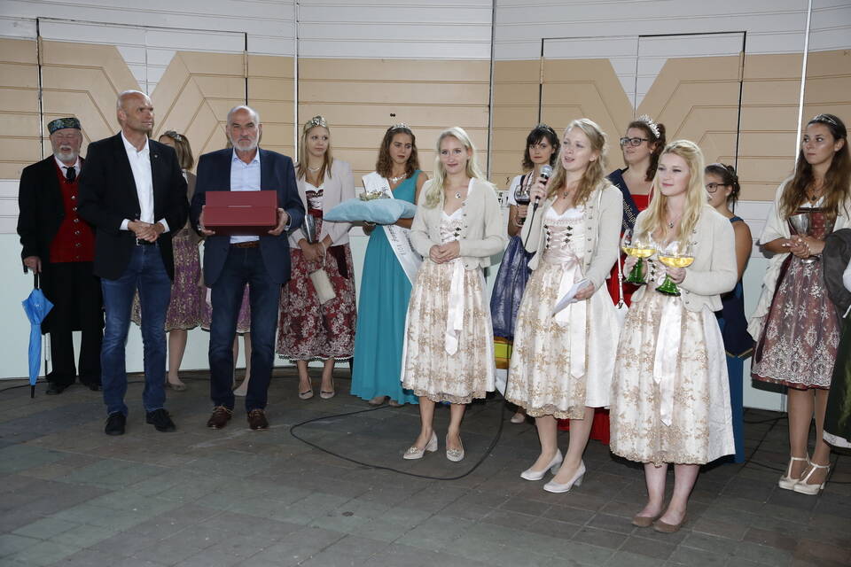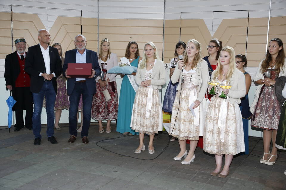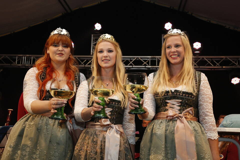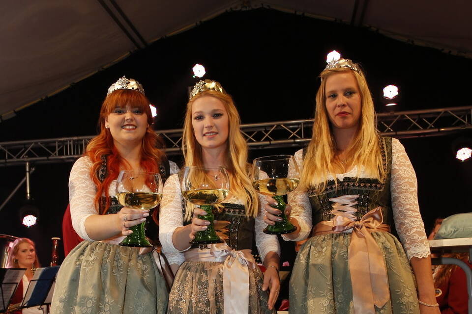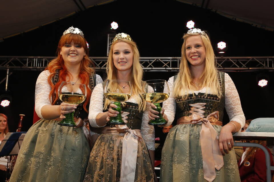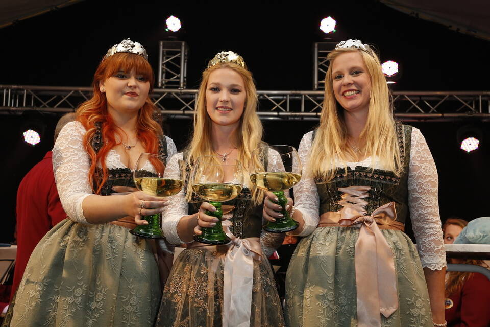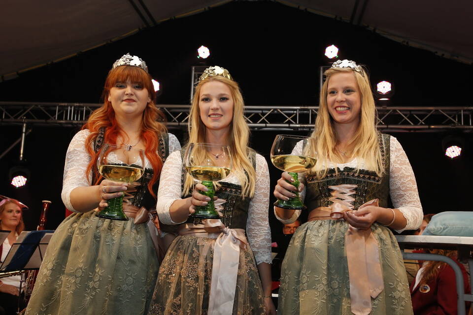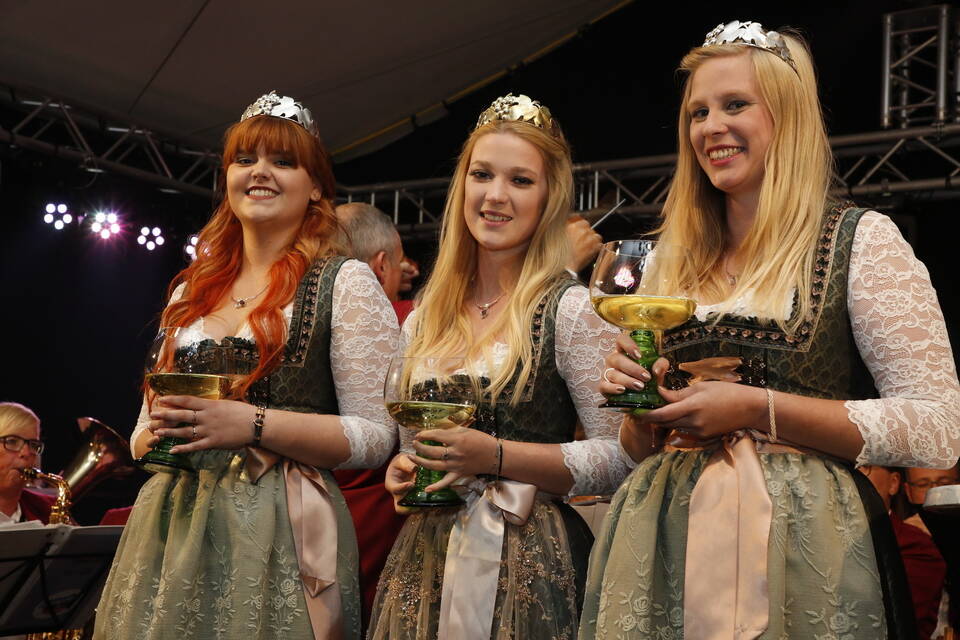 Die Hitze der zurückliegenden Wochen war einer erfrischenden Kühle gewichen. So gehörte zwar für später ein Pulli oder eine Jacke zu der Grundausstattung der Besucher, aber viele zeigten sich von den erträglichen Temperaturen doch eher angetan. Und so schmeckte der von den "Winzern von Baden" spendierte, halbtrockene Müller-Thurgau mit dem wohlklingenden Namen "Freischütz" allen bei der Eröffnungszeremonie. Für Patricia Theis und ihre Prinzessinnen Katharina Schoch und Mona Kenz hieß es, Abschied zu nehmen. Für Mona allerdings war es nicht der letzte Auftritt an diesem Abend, wurde sie doch knapp zwei Stunden später zur neuen Weinkönigin gekrönt.