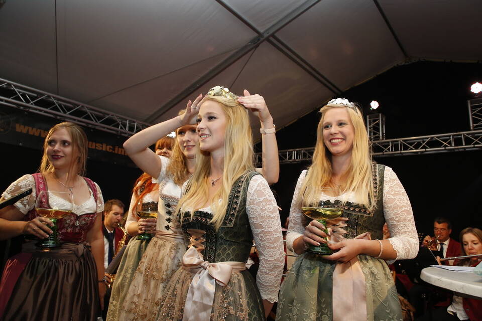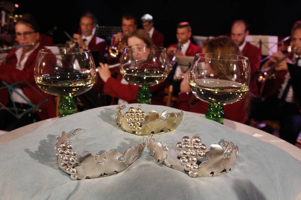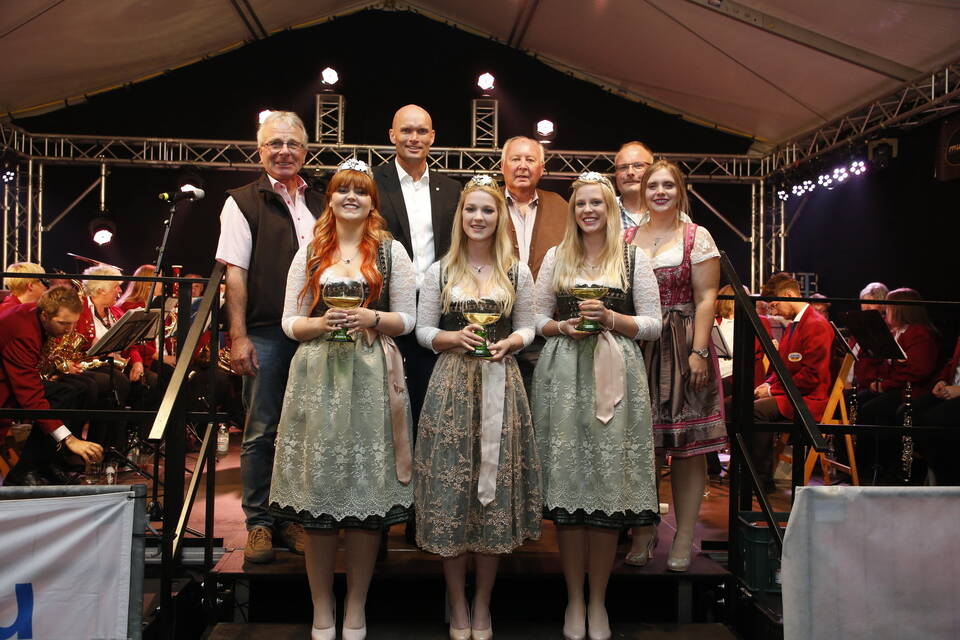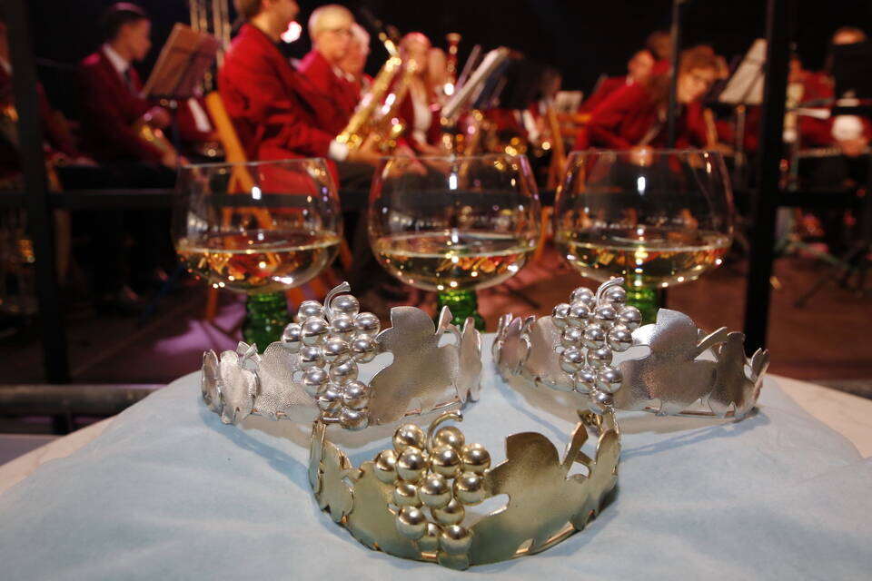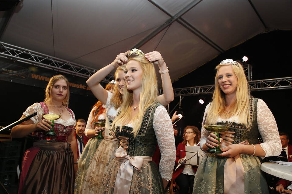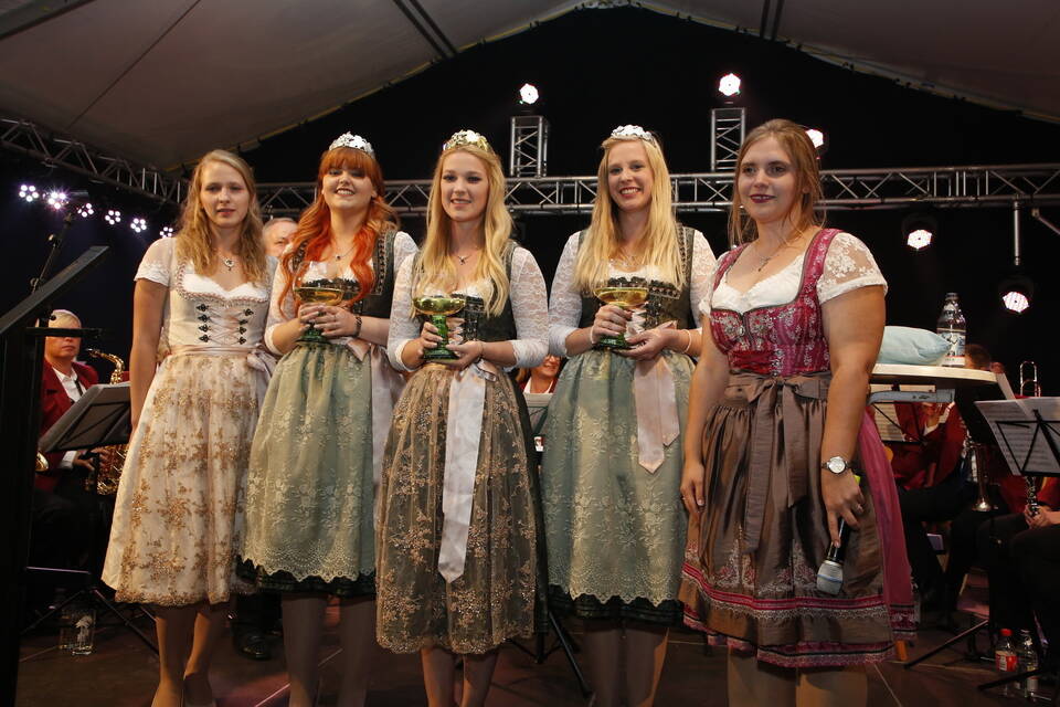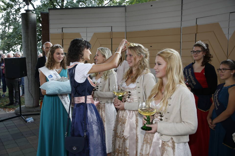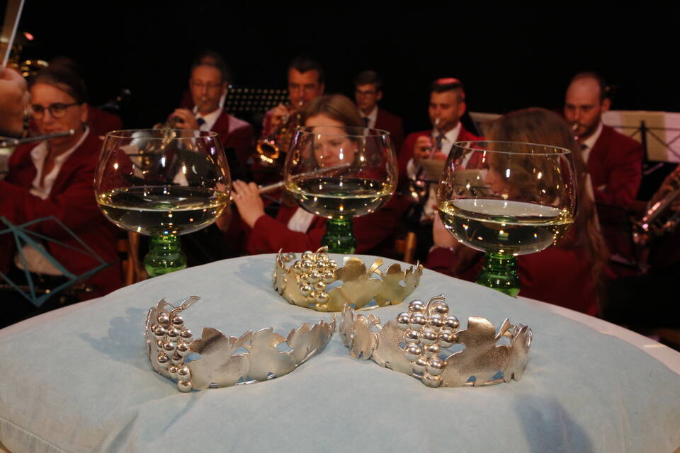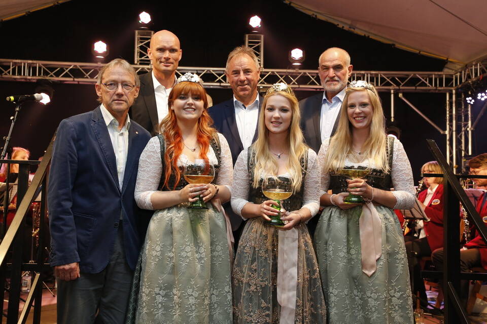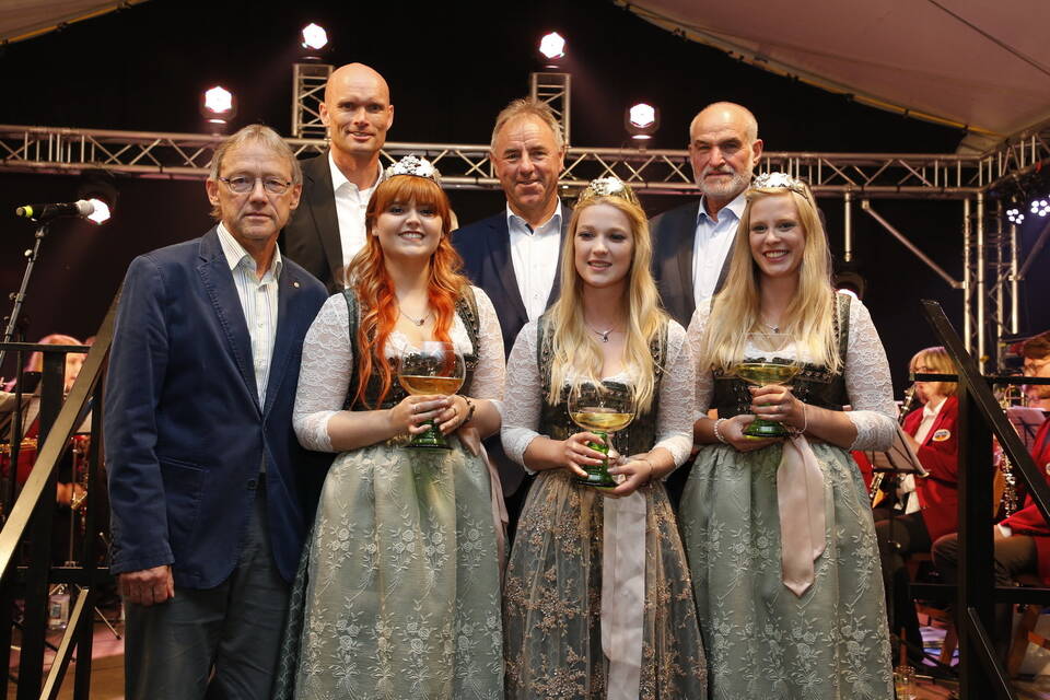 Die Hitze der zurückliegenden Wochen war einer erfrischenden Kühle gewichen. So gehörte zwar für später ein Pulli oder eine Jacke zu der Grundausstattung der Besucher, aber viele zeigten sich von den erträglichen Temperaturen doch eher angetan. Und so schmeckte der von den "Winzern von Baden" spendierte, halbtrockene Müller-Thurgau mit dem wohlklingenden Namen "Freischütz" allen bei der Eröffnungszeremonie. Für Patricia Theis und ihre Prinzessinnen Katharina Schoch und Mona Kenz hieß es, Abschied zu nehmen. Für Mona allerdings war es nicht der letzte Auftritt an diesem Abend, wurde sie doch knapp zwei Stunden später zur neuen Weinkönigin gekrönt.