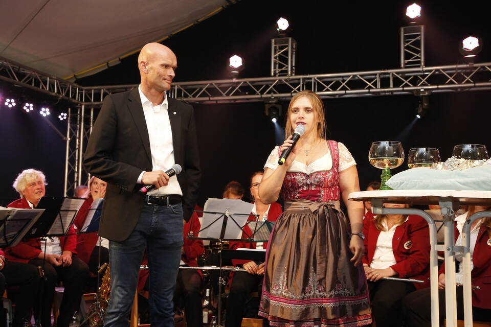 Im Zelt selbst hatte es Rebecca Rieger, selbst einmal Kurpfälzische Weinkönigin, übernommen, das neue Dreigestirn in sein Amt einzuführen und ein paar Interviews zu führen, ehe es um kurz nach 20 Uhr soweit war.
