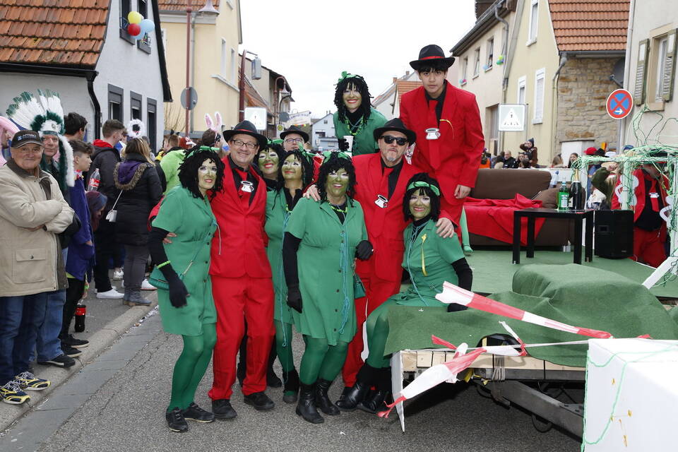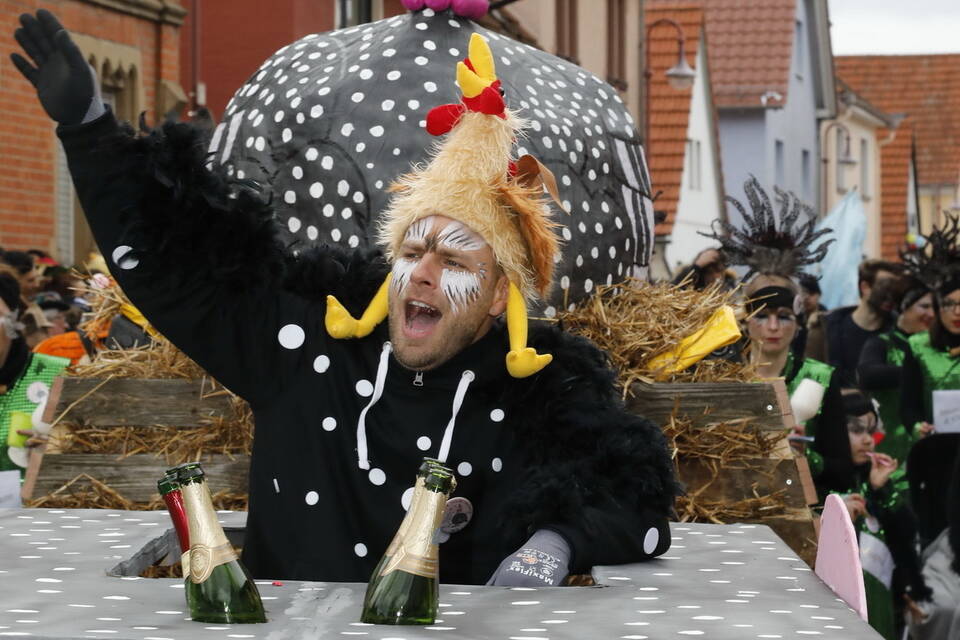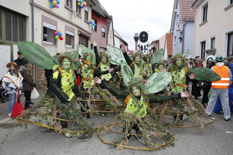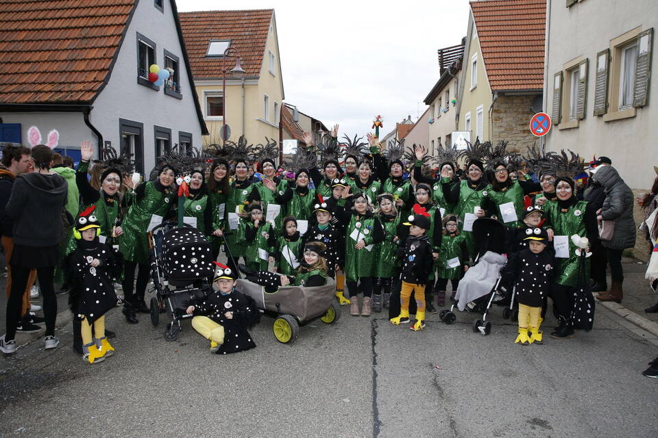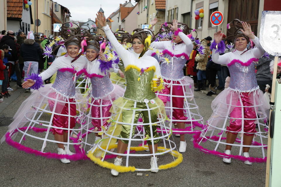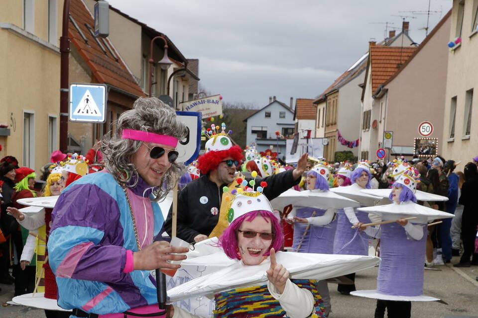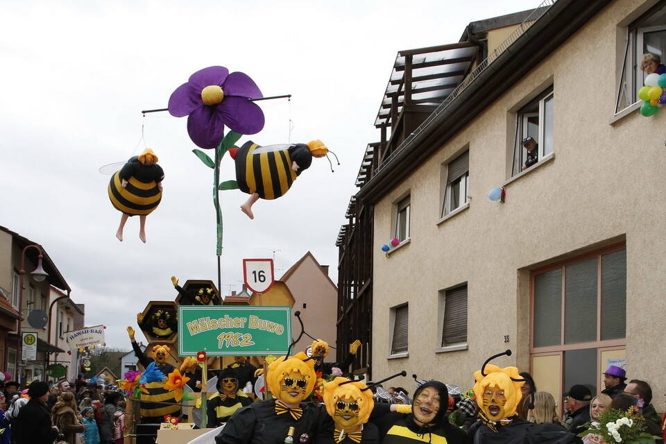 Mit fettem Federvieh auf dem Wagen präsentierten sich die "Mälscher Perlweinhühner", passend dazu ihre schillernd-grünen Kostüme mit fedrigem Kopfschmuck. Nur "Gugge und Tratsche im Sinn" hatten die "Mauläfflin", in ihren Affenkostümen schlüpften sie in kleine Hütten, schauten aus dem Fenster, und schon brachten sie die Gerüchteküche zum Brodeln. Mit dem KSV Malsch ging’s zurück in die Achtziger, wilde Vokuhilas und Neon-Sportanzüge inklusive. Einen riesigen Bienenstock, umschwirrt von "fetten Brummern" hatten die "Mälscher Buwe" gebaut. Die "Frauen New Age" drehten buchstäblich durch: Ihre pittoresken Kleider waren kleine Karusselle. Technohits aus den Neunzigern und die passende Choreografie hatten die "Haubentaucher" als "New Kids" dabei. Die "Mälscher Feger" waren "von der Rolle", als Garnrollen mit Nadelkissenhüten verbreiteten sie gute Laune.