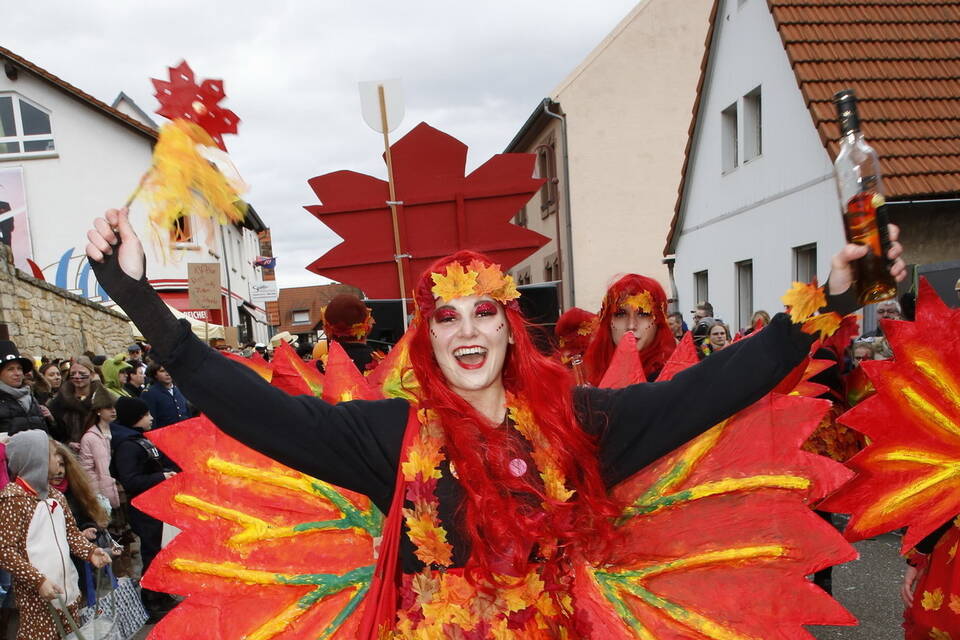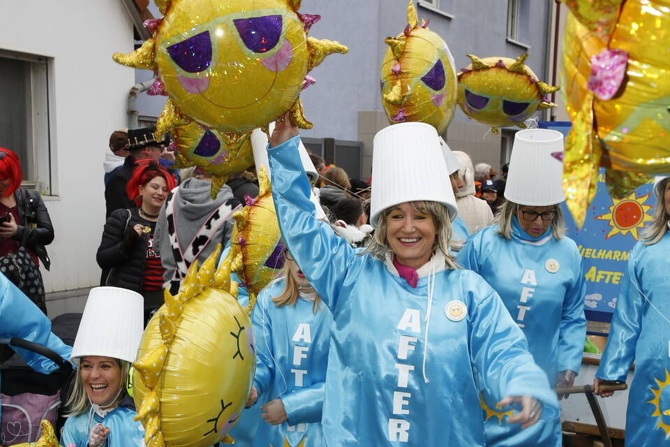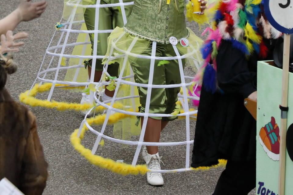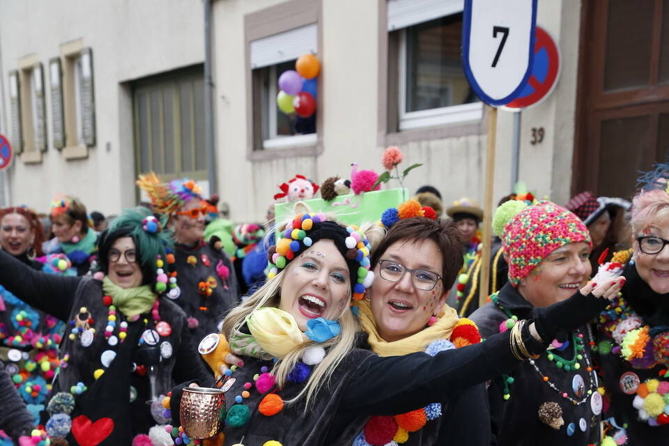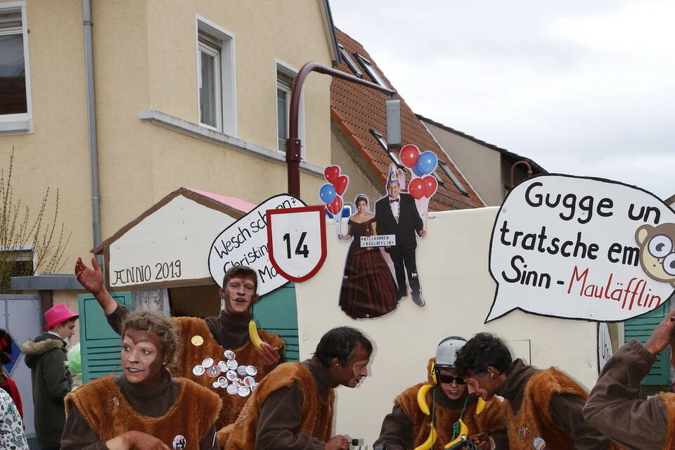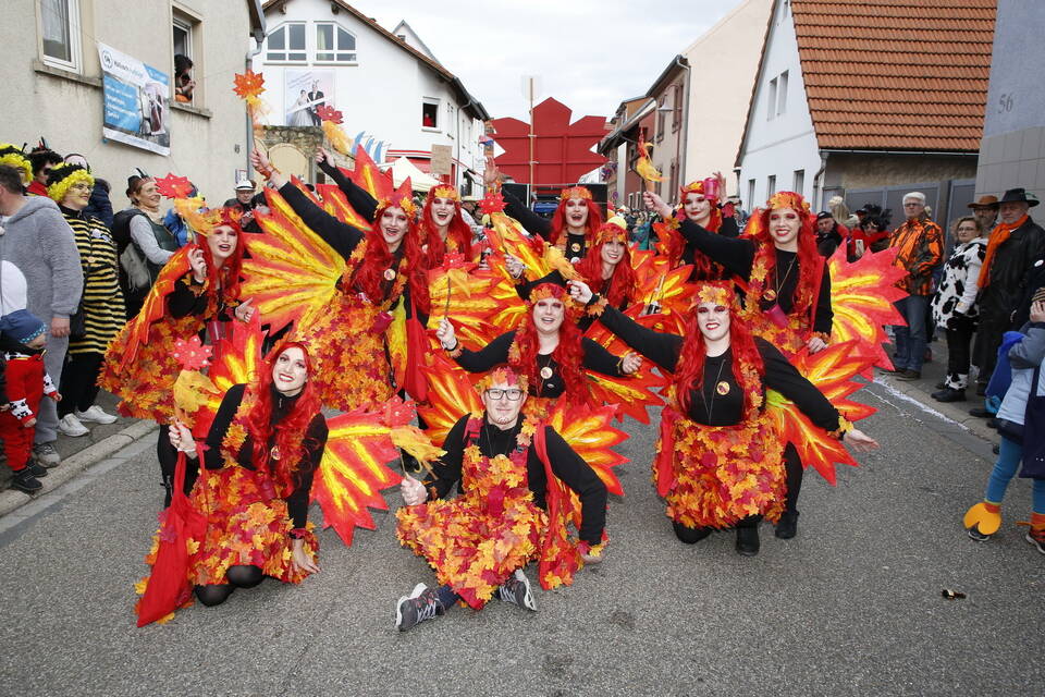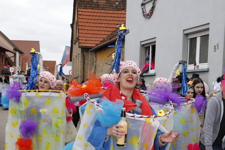 Mit fettem Federvieh auf dem Wagen präsentierten sich die "Mälscher Perlweinhühner", passend dazu ihre schillernd-grünen Kostüme mit fedrigem Kopfschmuck. Nur "Gugge und Tratsche im Sinn" hatten die "Mauläfflin", in ihren Affenkostümen schlüpften sie in kleine Hütten, schauten aus dem Fenster, und schon brachten sie die Gerüchteküche zum Brodeln. Mit dem KSV Malsch ging’s zurück in die Achtziger, wilde Vokuhilas und Neon-Sportanzüge inklusive. Einen riesigen Bienenstock, umschwirrt von "fetten Brummern" hatten die "Mälscher Buwe" gebaut. Die "Frauen New Age" drehten buchstäblich durch: Ihre pittoresken Kleider waren kleine Karusselle. Technohits aus den Neunzigern und die passende Choreografie hatten die "Haubentaucher" als "New Kids" dabei. Die "Mälscher Feger" waren "von der Rolle", als Garnrollen mit Nadelkissenhüten verbreiteten sie gute Laune.