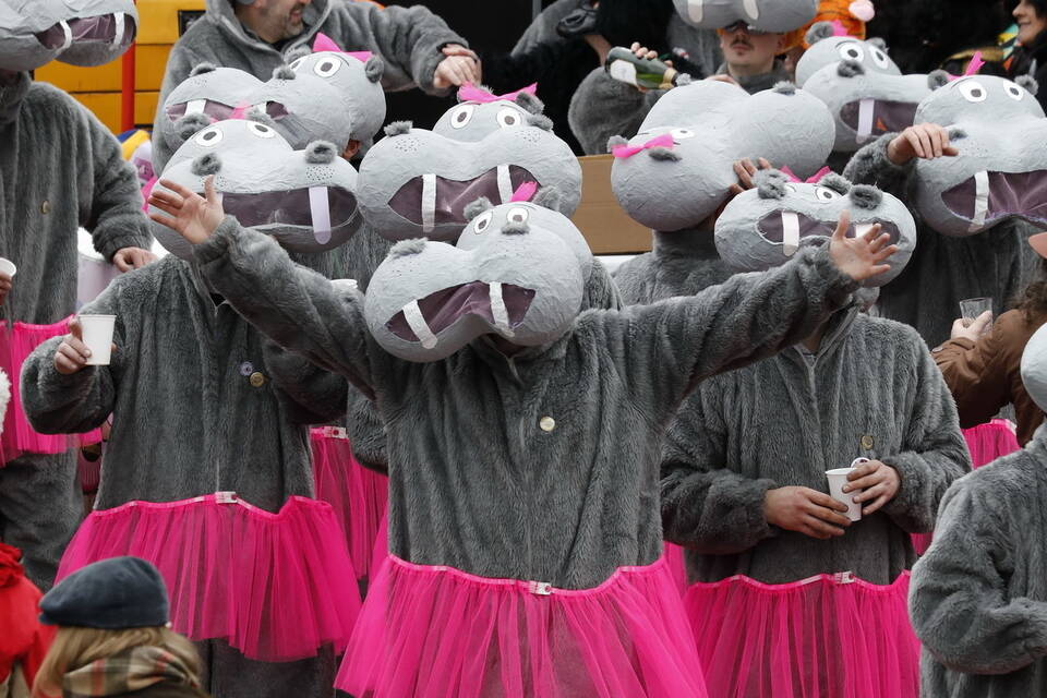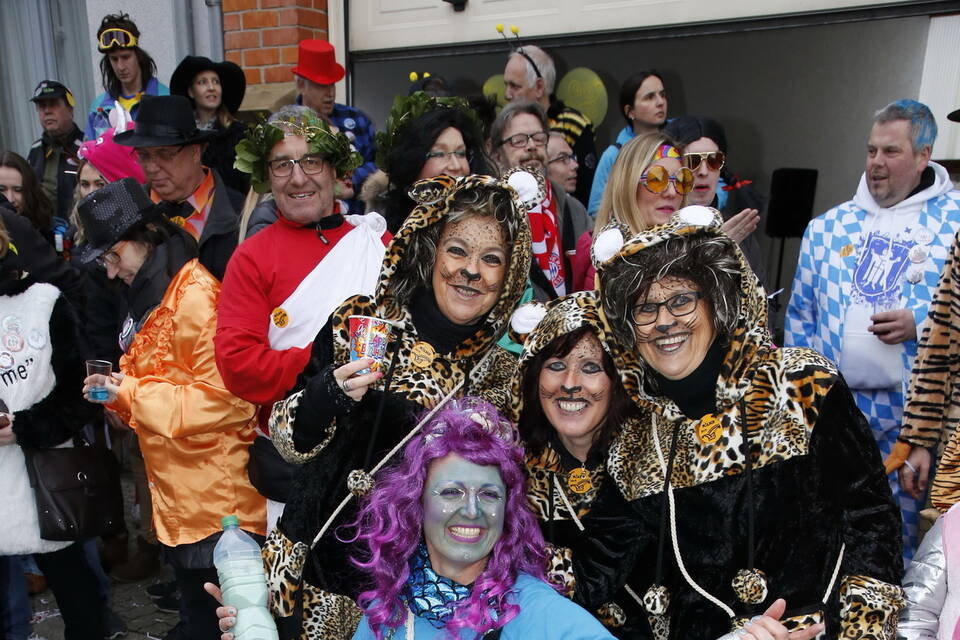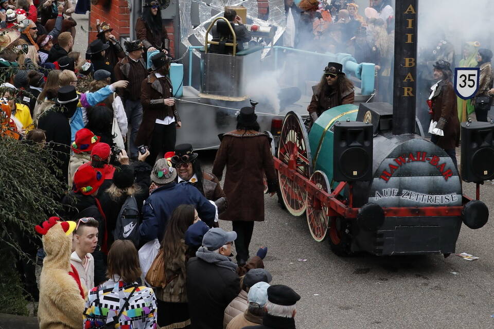 "Bommelnd auf Axe" waren die "Roter Weiwer", passend zierten bunte Filzbällchen ihre Kostüme. "Bänker" mit immensem Tresor waren die "Hungahoogä", die zudem von urigen Holzbänken Hochprozentiges ausschenkten. "Zehn Prozent und mee": Dieses Versprechen glaubte aber wohl niemand, egal nach wie vielen Kurzen. "Bettys Eier" waren diesmal "nacked", aber züchtig versteckt hinter tragbaren Duschvorhängen. Die "Mewieschene" drohten mit dem "Mexit", das mit dem Austreten hatten sie aber falsch verstanden: Sie stellten sich an Pissoirs auf ihrem Wagen und warfen mit Toilettenpapierrollen. Zum Song "Cordula Grün" tanzten die "Scheißhäffe" und die "Elwätritsche".