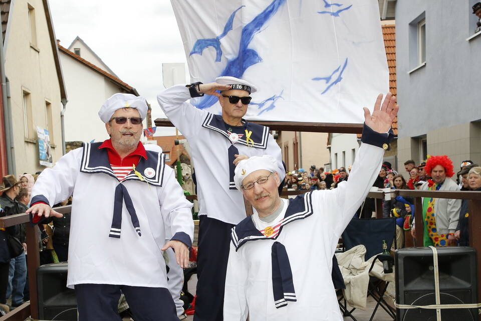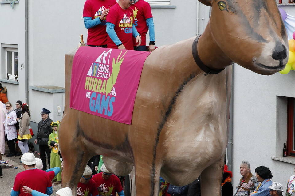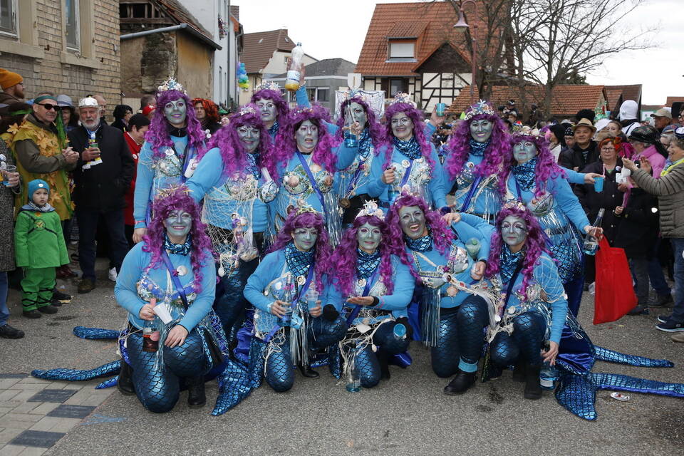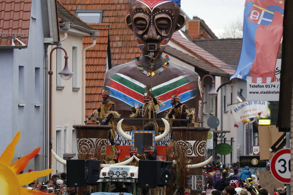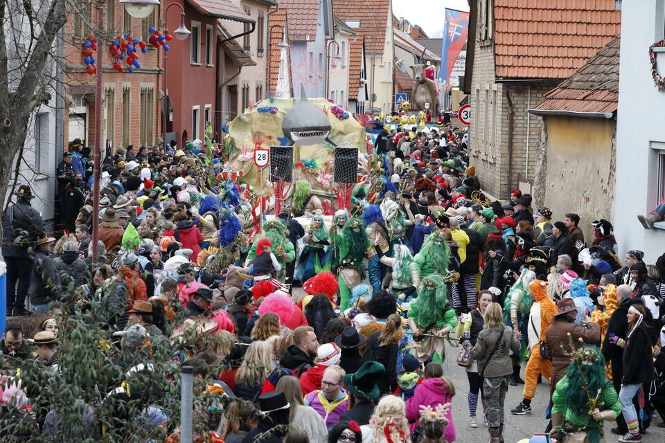 Auf ihrem "Traumfloß" segelten die "Rumpsteaks" in feschen Matrosenanzügen daher. Feuerrote Schwingen trugen die "Zammgewärfelte" mit dem Motto "Holla die Herbstfee". Richtig lecker sah das "Dream Team" des TSV Malsch aus, es war "eine von 80 Melonen", eine Anspielung auf den Max-Giesinger-Song. Als süße "Pferde vom Nil" war die "Schickeria" dabei, gefolgt von den "Hodenkobolden": Als afrikanischer Stamm trugen sie fantasievolle Körperbemalung und hatten auf ihrem Wagen neben einer farbenfrohen Totenmaske eine gewaltige Götzenstatue errichtet. Nicht weniger farbenprächtig die "Golden Girls" als "Letzenbergnixen" mit Meerjungfraukostümen, die einen "Triton" umringten. Andere Meeresgottheiten waren bei den "Klabuschdabärlin" zu sehen, Poseidons und Medusen vielleicht. Auf ihrem Wagen hatten sie ein haushohes Korallenriff mit lebensgroßem Weißem Hai.