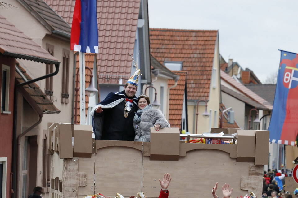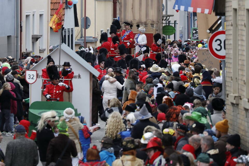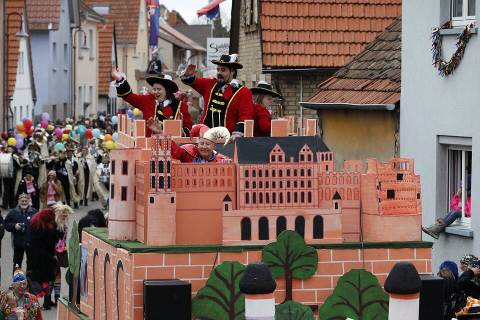 "Elfe aus dem Brettwald" waren die geflügelten "Willi Poser". Und die Flugsportgemeinschaft Letzenberg präsentierte sich als "Leibgarde des Prinzenpaares": Ihre stolz gereckten Hellebarden und Lanzen waren weithin zu sehen, noch besser nur ihre gigantische Burg. Die vielen Details waren vom Heidelberger Schloss inspiriert, obenauf ein Hofnarr und eine Schar Herolde mit Posaunen. Eine weitere Festung folgte: Traditionell bildete die KaGe Blau-Rot mit ihrer "Narrenburg" den Abschluss des Umzugs.
