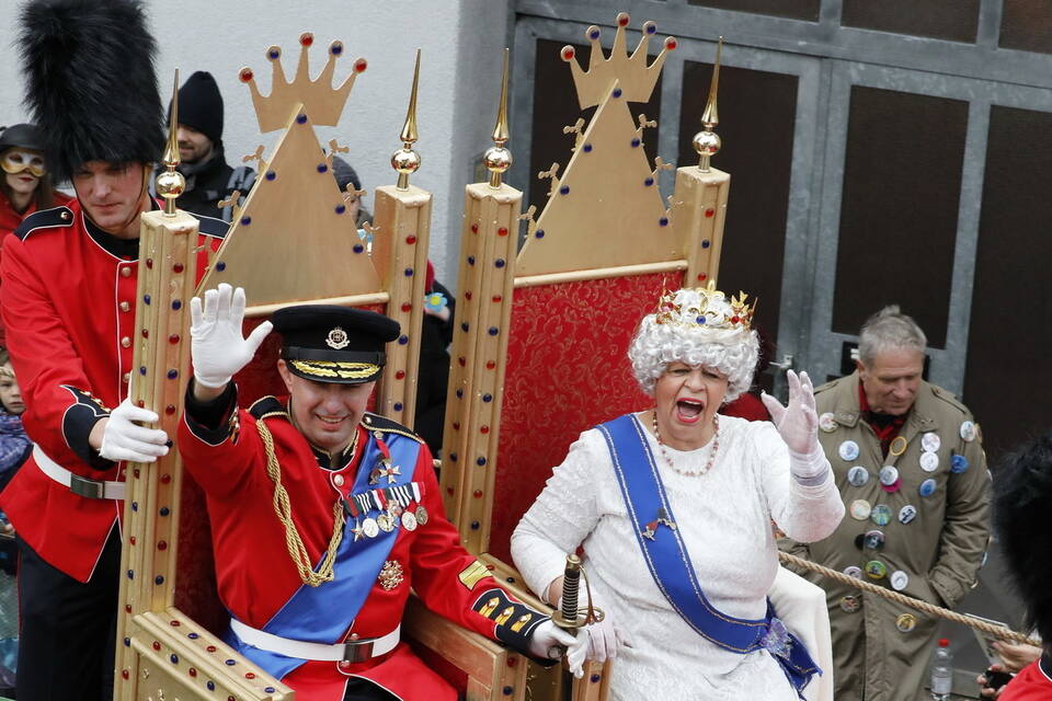 Die "Tornschlebblin" trugen bunte, käfigartige Reifröcke und ließen die "Veggeli pfeife". Als "British Guards & the Queen" waren "Brosome" und Letzenberg-Tierpark dabei: Unverkennbar die roten Uniformjacken und schwarzen Fellmützen, überraschend fidel und forsch die Königin. Über allem thronte der Uhrenturm des "Big Ben", fast in Originalgröße. Die "Musikkapelle Laufbachmusikanten" freute sich: "Unser Dirigent ist Prinz" und spielte lautstark auf. Detailreich gestaltete Seepferdchen hatten "Die kleinen Feiglinge" als Kostüme gewählt.
