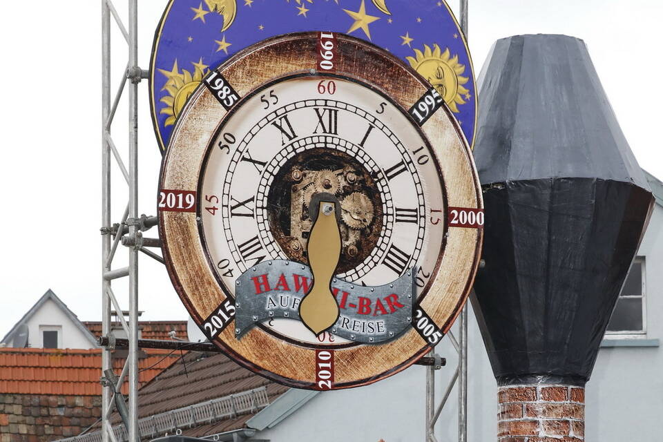 Auf Zeitreise war auch die "Hawaii Bar", aber diesmal mit H.G. Wells: Von Verfilmungen der "Zeitmaschine" inspiriert war das dampfgetriebene, laute Pfiffe aus einem Ventil ausstoßende Ungetüm, gezogen von der bekannten "Adler"-Lokomotive. Aus viktorianischer Zeit stammten auch die große Uhr mit Mondphase und die Abenteurer-Kostüme. Bürgermeisterin Sibylle Würfel folgte unerschrocken der Aufforderung, in die Zeitmaschine einzusteigen, wohl wegen des Versprechens "macht 20 Jahre jünger". Die folgende wilde Fahrt in einer Rummelplatz-Gondel überstand die Bürgermeisterin erstaunlich munter.