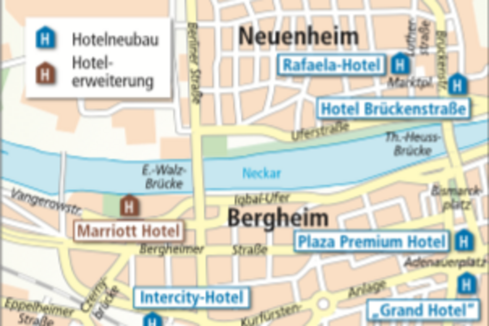 Die Hotel-Neubauten konzentrieren sich vor allem auf den Bereich um den Hauptbahnhof, wo das neue Kongresszentrum entsteht. Mit 430 Betten im Hotelbereich (Drei-Sterne-Premium) und 180 Betten im angegliederten Boardinghaus ist das "Star Inn", Speyerer Straße 9, seit April 2018 der größte Beherbergungsbetrieb der Stadt. Bis dahin war es das "Marriott" mit 496 Betten. Direkt angrenzend in der Carl-Benz-Straße entsteht das "Meininger"-Low-Budget-Hotel mit 331 Betten. Die Eröffnung ist für Anfang 2020 geplant. Am heutigen Dienstag öffnet das "Ninety Nine Hotel" (drei Sterne) mit 214 Betten am Czernyring seine Pforten. Das Rafaela-Hotel am Neuenheimer Marktplatz mit 57 Betten hat im Dezember 2018 aufgemacht. Im "Qube-Hotel Bahnstadt" (vier Sterne) an der Ecke Grüne Meile/Da-Vinci-Straße werden Ende 2019 die ersten Gäste übernachten können, im "Plaza Premium" (Vier-Sterne-Superior) im ehemaligen Fernmeldeamt in der Sofienstraße soll es im März 2020 soweit sein. Gebaut wird auch am Königstuhl-Hotel, dort ist die Fertigstellung für Ostern 2020 geplant. In Planung sind zudem das Intercity-Hotel (vier Sterne) am Bahnhof mit 198 Zimmern und angeschlossenem Boardinghouse (Eröffnung: Anfang 2021), das "Grand Hotel" in der Rohrbacher Straße (Umbau ab 2022), das Kongress-Hotel am Europaplatz und die Erweiterung des "Marriott"-Hotels. (tt)