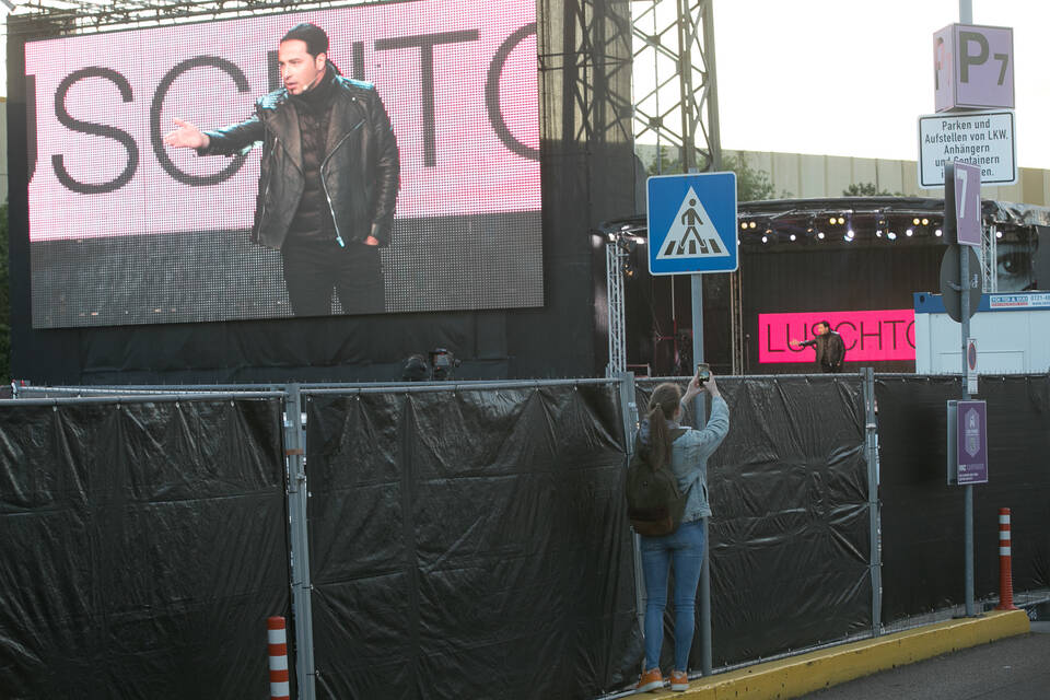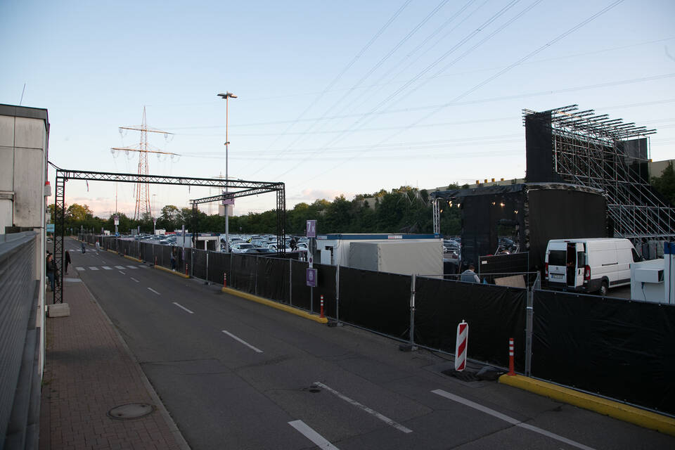 Die 225 Fahrzeuge, die den 10.000 Quadratmeter großen Parkplatz füllen, stehen versetzt. Die allermeisten Insassen, bis auf jene in den Autos ganz vorne, sehen den Star des Abends dennoch nur auf der Kinoleinwand und hören ihn lediglich übers Radio. Dabei steht er gleich rechts daneben, auf einer vergleichsweise kleinen, minimalistisch ausgestatteten Bühne, auf die die Kameras ausgerichtet sind. Live ist das schon, aber ein echtes Live-Erlebnis vermag diese Form der Präsentation nicht zu ersetzen.