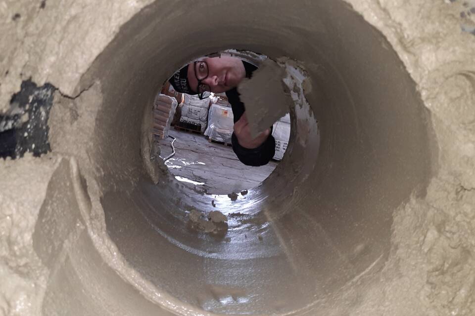 Eine weitere Herausforderung ist das abgetragene Material, das nach der Zerkleinerung noch mehr Volumen hat als der Tunnel selbst. Der Abtransport ist aufwendig und zeitraubend. Der Dirt-Torpedo zerkleinert das Material, bevor es mit einem Saugbagger entfernt wird. Auch die Methode, die Tunnelwand mit vorgefertigten Beton-Teilen zu verschalen, hat das Team weiterentwickelt: In Kooperation mit Sika Deutschland entstand ein Beton-Liningsystem, das hinten an der Maschine angebracht ist. Es spritzt den Tunnel direkt während des Bohrens mit Beton aus und kann flexibel mit Kurven umgehen.