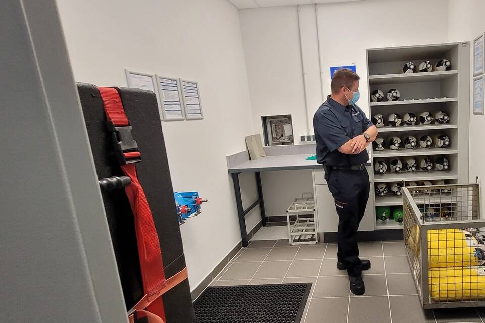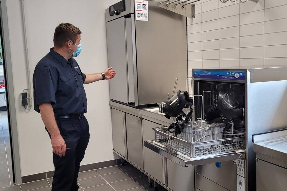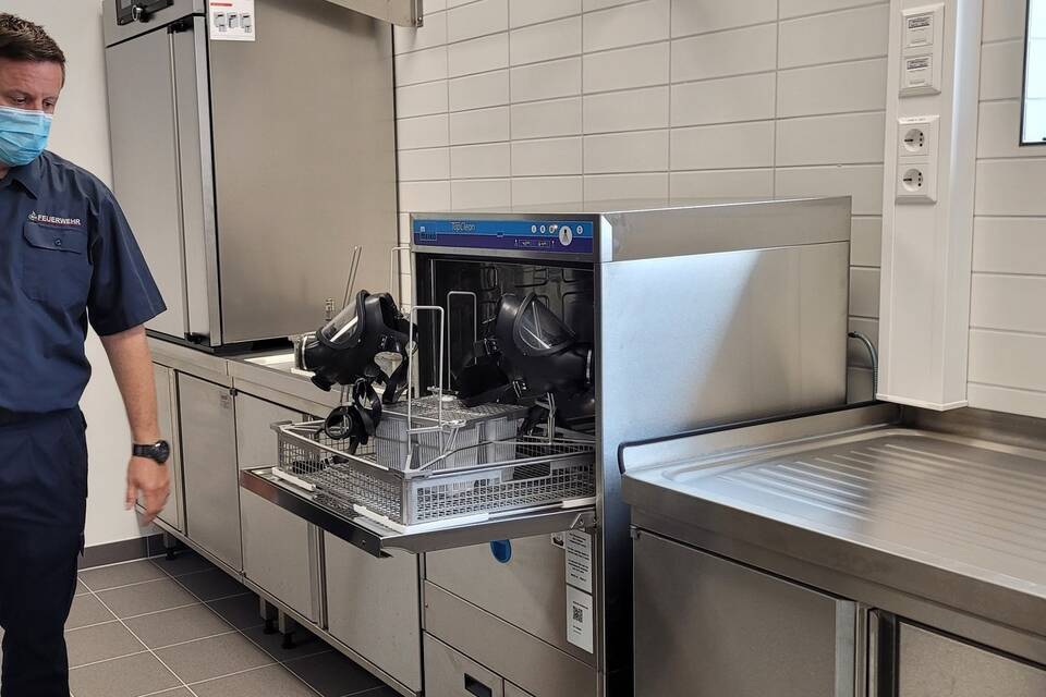 Außerdem wurden im Erdgeschoss eine Kleiderkammer, helle Umkleide- und Duschräume für die Feuerwehrfrauen und -männer, eine Atemschutzwerkstatt, die Schlauchpflege (eine Schlauchwaschanlage, die wäscht, trocknet, prüft, wickelt und dokumentiert) sowie ein Hochregallager und sonstige Werkstatträume untergebracht. Die Einsatzkräfte können nach einem Einsatz auf kleinen und direkten Wegen zur Stiefelwaschanlage, zum Händewaschbecken, dann ihre Kleidung ablegen und duschen. Laut Lenk ist der Atemschutz der "aufwendigste Bereich": "Da muss alles zu 200 Prozent passen".