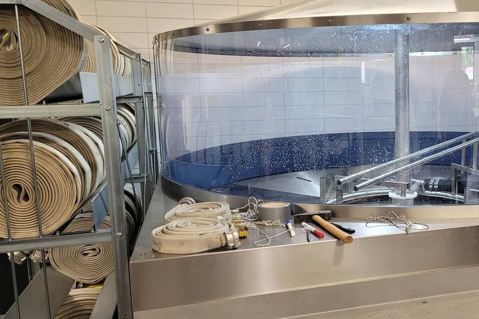 Das muss auch sein, da die FFW bereits zwölf Minuten nach der Alarmierung vor Ort sein muss. Laut Lenk gilt das für das Stadtgebiet und die Ortsteile. Die Einsatzkräfte parken vor dem Gebäude in der Güterbahnhofstraße, ziehen sich direkt um und rücken über den Neuen Weg aus. Somit ist eine Trennung von ausrückenden und ankommenden Fahrzeugen zum Unfallschutz gewährleistet. Im Erdgeschoss entstanden 14 Fahrzeugabstellplätze und eine Waschhalle, deren Stellfläche als vollwertiger Fahrzeugabstellplatz genutzt werden kann. Somit stehen 15 neue Abstellplätze zur Verfügung. 13 Einsatzfahrzeuge und zwei Anhänger stehen dort derzeit.