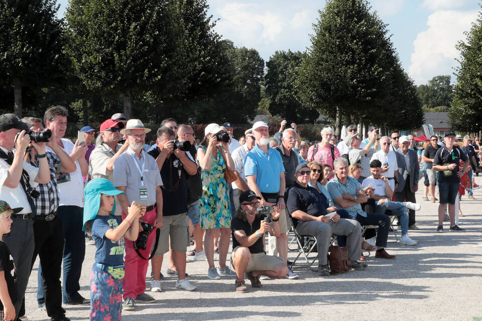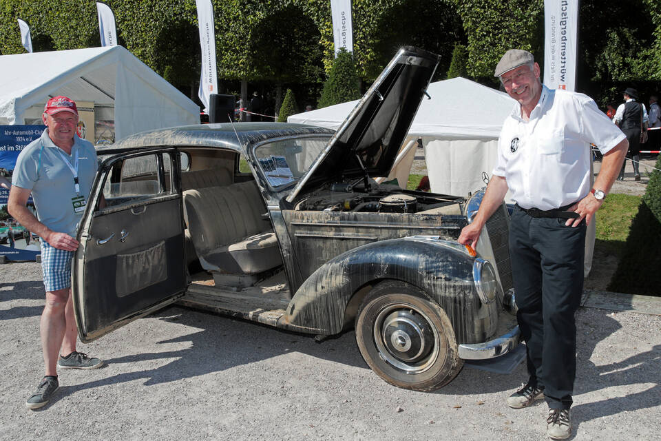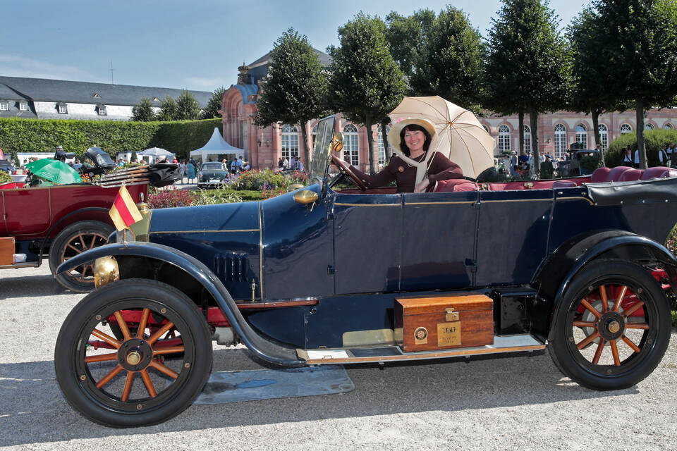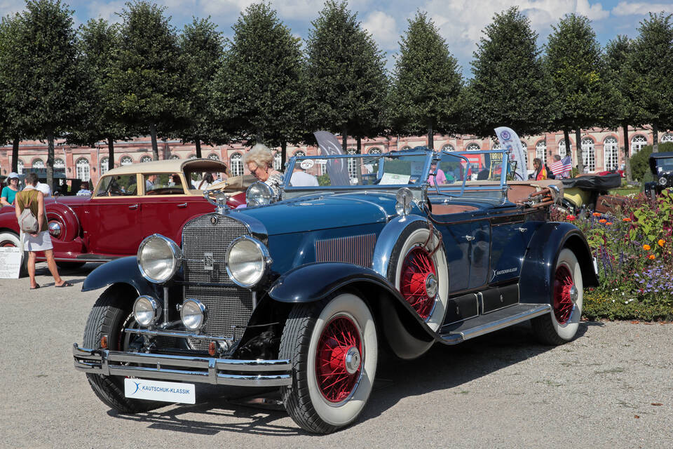 Ein automobiles Kleinod nach dem anderen rollte über die Rampe des Glücks, die am Arionsbrunnen in der Hauptachse des Schlossgartens aufgebaut war, und auf der die glücklichen Gewinner ihre Pokale überreicht bekamen. Johannes Hübner plauderte bei jedem Schmuckstück auf vier Rädern über Sonderkarosserie, fehlende Vorderradbremse, Holz- und Chromspeichen oder Zusatzklappsitze. Die Motorengrößen, manche über sieben Liter, sind ihm genauso geläufig wie die Formen der unnachahmlich gestalteten Kühlerfiguren.