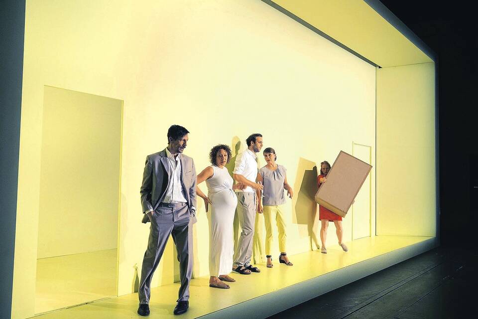 Auf der hellen Guckkasten-Bühne: Das Baseler Ensemble zeigt Ewald Palmetshofers Hauptmann-Überschreibung "Vor Sonnenaufgang" beim Stückemarkt. Foto: Sandra Then