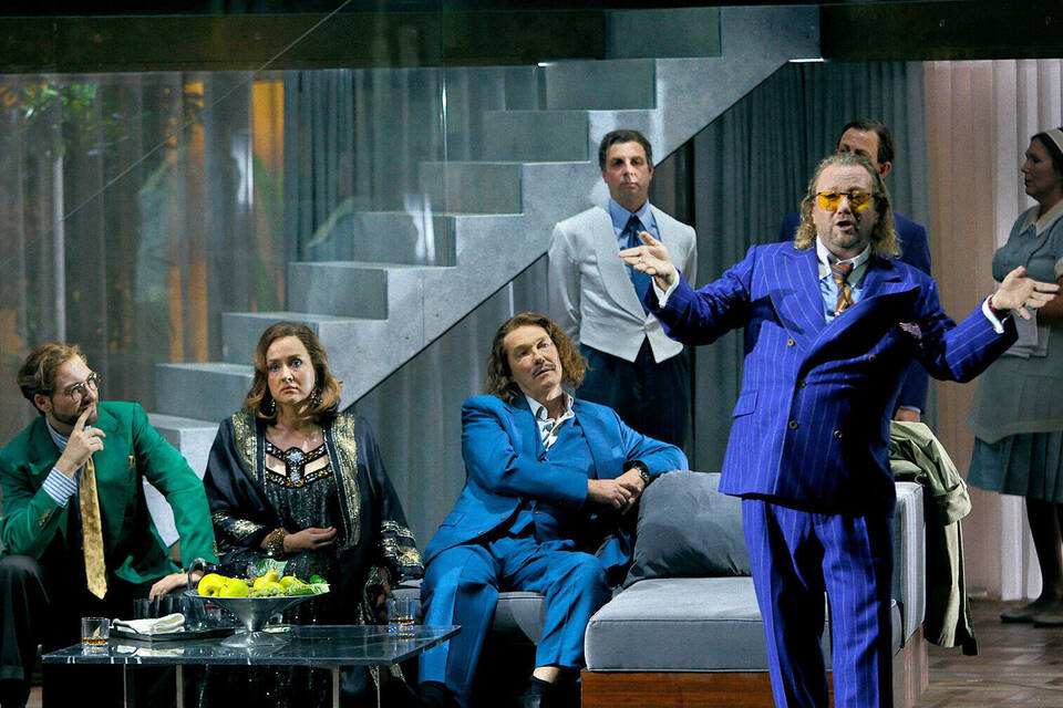 Aus den Tiefen des Rheines hinauf auf wolkige Höhen. Bühnenbildnerin Andrea Cozzi lässt den Pool mit Parkett abdecken, auf das die Innenräume Walhalls geschoben werden. Die sehen aus wie die abgeschmackten Interieurs von wohlsituierten Bösewichtern in schlechten Krimiserien: In viel Sichtbeton stehen Designermöbel herum. Das Arbeitszimmer des Starjuristen Wotan im Obergeschoss ist ganz in Holz gefasst. Natürlich fahren die beiden Architekten im Zuffenhausener SUV bei Wotan vor und verhandeln über die Zahlungsmodalitäten. Vereinbart war ja, den beiden baukundigen Riesen die Schwägerin Wotans zu überlassen. Doch Freia hat darauf keine Lust, und so wird nach einem Ausweg gesucht.