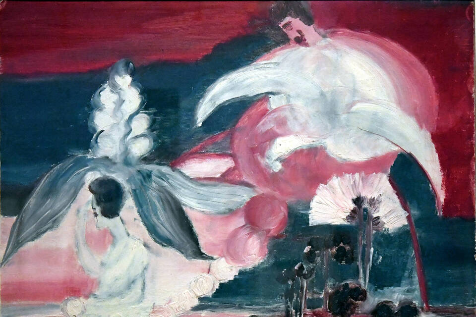Else Blankenhorns „Selbstbildnis mit Kaiser Wilhelm II. als Schwan“ (Öl auf Graupappe, 1908-1919): Laut Katalog eine „eigenwillig sexualisierte Szene“, die auf Richard Wagners Schwanenritter Lohengrin und auf die Verehrung des letzten deutschen Kaisers anspielt. Foto: F. Hentschel