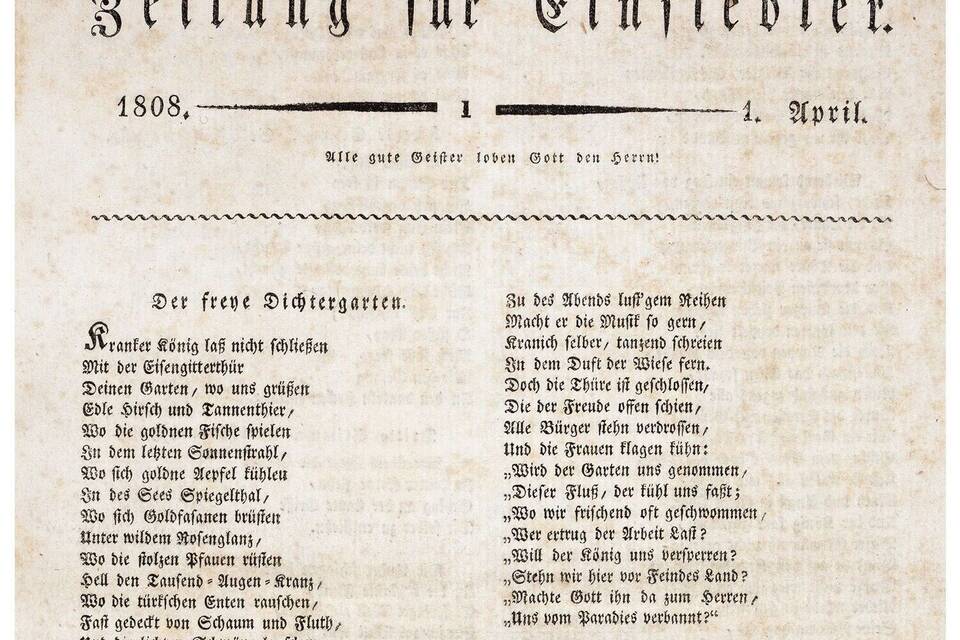 Abermals vergingen Jahre, bis 1806 wieder ein "Heidelberger Wochenblatt" erschien, das freilich auf den Charakter eines Amtsanzeigers beschränkt blieb. Während nur weniger Monate, und zwar vom 1. April bis Ende August des Jahres 1808, gab es in Heidelberg sogar eine "Zeitung für Einsiedler". Dahinter verbirgt sich ein von der Forschung vielfach so bezeichnetes "literarisches Kuriosum", nämlich die anonym von Achim von Arnim (unter redaktioneller Mitwirkung von Clemens Brentano und Joseph Görres) herausgegebene Romantiker-Zeitschrift. Nach dem Willen ihres Herausgebers diente sie ,,der Erweckung und Erfrischung des unschuldigen poetischen Sinns". Aufgrund des konsequenten Verzichts auf die Wiedergabe jeglicher Tagesneuigkeiten handelte es sich hierbei indessen nicht um eine Zeitung, sondern um eine zwischen Buch und Zeitung angesiedelte Zeitschrift, der letztlich aber kein Erfolg beschieden war.