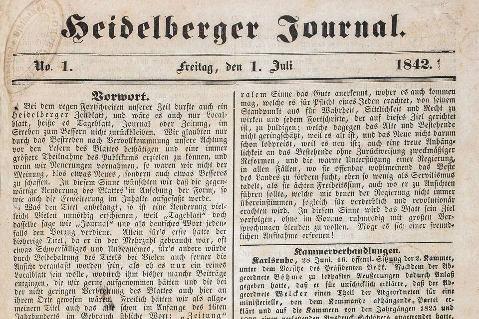 Ab 1831 firmierte das "Heidelberger Wochenblatt" unter dem Titel "Heidelberger Wochenblätter", deren Fortsetzung die von ihrer Tendenz her als gemäßigt liberal einzustufenden "Heidelberger Tageblätter (1840-42) und in der Folge das "Heidelberger Journal" (1842-71) bildeten. Mit der Umbenennung von 1842 suchte man das dem bisherigen Titel anhaftende Image des Schwerfälligen und Unbequemen eines vermeintlich "nur reinen Localblattes" abstreifen. So präsentierte sich das "Journal" denn auch in erweitertem Umfang, um in der "Mittheilung politischer und gemeinnütziger Nachrichten, so wie der versprochenen Unterhaltungslectüre nicht allzusehr beengt zu sein".