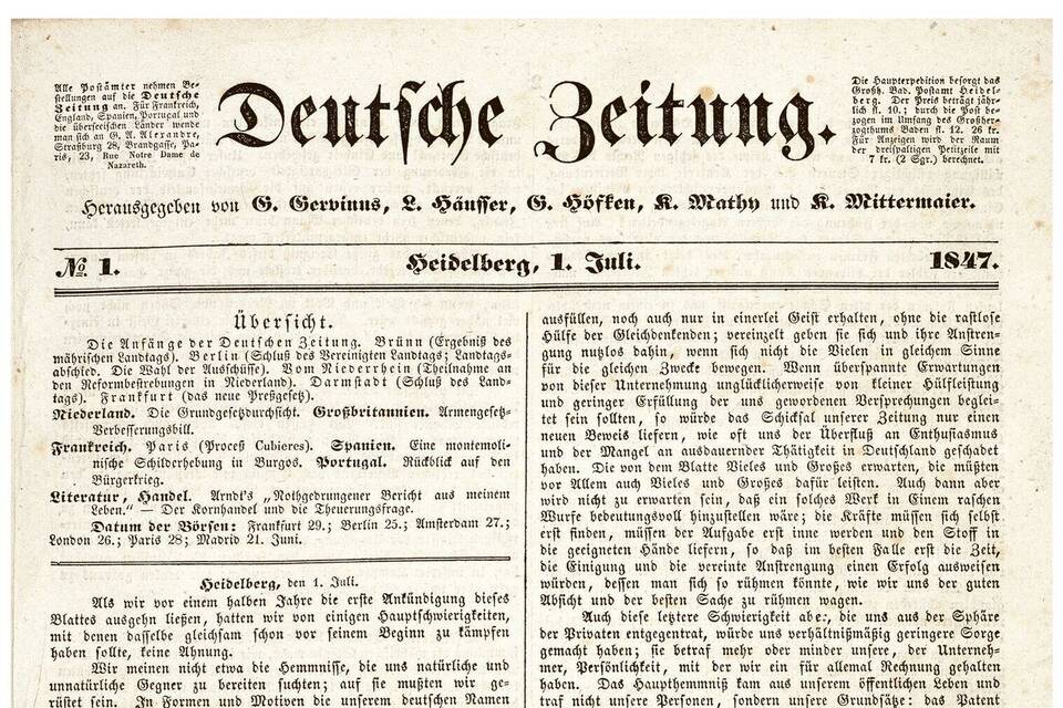 Die Pressefreiheit war bereits auf dem Hambacher Fest (25. Mai 1832) eine der zentralen Forderungen gewesen. Aufgrund ihrer besonderen politischen Prägekraft und/oder durch ihren Radikalismus lassen sich in den 40er Jahren des 19. Jahrhunderts zunehmend sogar überregionale Auswirkungen der Zeitungen feststellen. Dafür ist die von G. Mohr in Heidelberg gedruckte und von der Buchhandlung Bassermann in Mannheim verlegte "Deutsche Zeitung" ein eindrucksvolles Beispiel. Die Zeitungsgründung geht zurück auf einen am 29. November 1846 in Durlach gefassten Beschluss der Liberalen Partei in Baden. Die Redaktion lag in den Händen der Heidelberger Professoren Gervinus, Häusser und Mittermaier.
