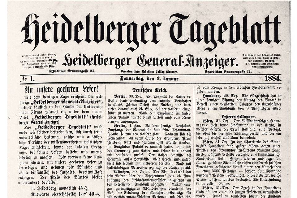 Zuletzt sei an eine Zeitungsgründung des 19. Jahrhunderts erinnert, die heute zwar ebenfalls verschwunden, aber noch keineswegs vergessen ist. Gemeint ist der "Heidelberger Generalanzeiger" von 1884, besser bekannt als "Heidelberger Tageblatt". Unter diesem Titel erschien am 3. Januar 1884 die erste Nummer unter Leitung von Philipp Klausner. Das Verlagsrecht hatte der Verlag (Gustav) Wurm & (Carl) Pfeffer 1884 von Gebr. Huber in der Zwingerstraße erworben. Damals lag die Auflage bei gerade 1000 Exemplaren. Mit einem Monatsbezugspreis von 45 Pfennigen war das Blatt die billigste Zeitung in Baden überhaupt. In der Ausgabe vom 15. März 1884 warb man mit folgendem "Credo" um Abonnenten: "Das HT hat es sich zur Pflicht gemacht, seinen werthen Lesern einen Lesestoff zu bieten, der alle und jeden befriedigt. Unser Programm besteht darin: Jede politische und religiöse Parteirichtung zu achten, streng an der gesetzlichen Ordnung festzuhalten, die Grundpfeiler unseres Staates und sozialen Lebens nach Kräften zu stützen und Sandkorn um Sandkorn am Bau der großen Humanität beitragen zu helfen."
