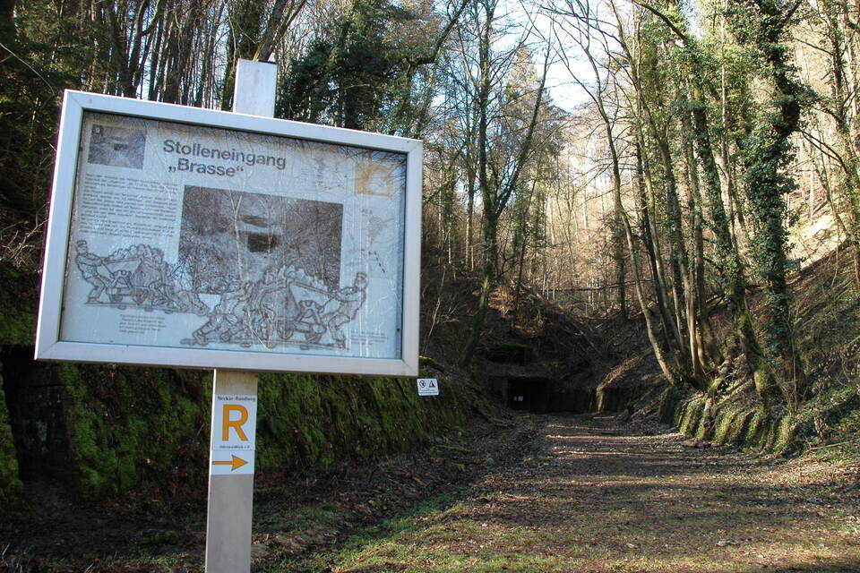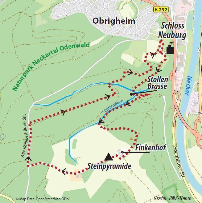 Strecke: Mit dem "gelben R" geht es vom Parkplatz Schloss Neuburg zum Stolleneingang "Brasse" und ein kleines Stück weiter, bis rechts die "gelbe 1" am Rand des Luttenbachtals abzweigt. Dem Weg folgen, bis er auf die "gelbe 6" trifft. Mit dieser Markierung rechts weiter zum Finkenhof, dann über die Hochfläche bis zur Ortsverbindungsstraße, dort rechts Richtung Obrigheim gehen. Nach ca. 600 Metern führt rechts die "gelbe 4" auf einem schnurgeraden Weg durch den Wald. An dessen Ende links gehen, an den nächsten beiden Abzweigungen rechts halten. In einer leichten Linkskurve führt rechts ein Waldpfad nach unten. Diesem bis zur Schlosswiese folgen. Über Feldwege geht es zurück zum Schloss Neuburg.