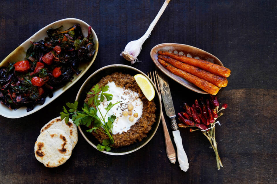 Die Auswahl der Zutaten für beispielsweise geschmorten Mangold mit Kichererbsen-Crème und Chili-Möhren folgt nach dem Prinzip: regional, saisonal, frisch vom Markt. Foto: Manfred Zimmer/herrgruenkocht.de/dpa-tmn​