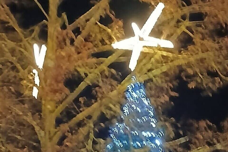 Beleuchteter Weihnachtsbaum vor dem Bammentaler Rathaus, von Ralph-Peter Fischer.