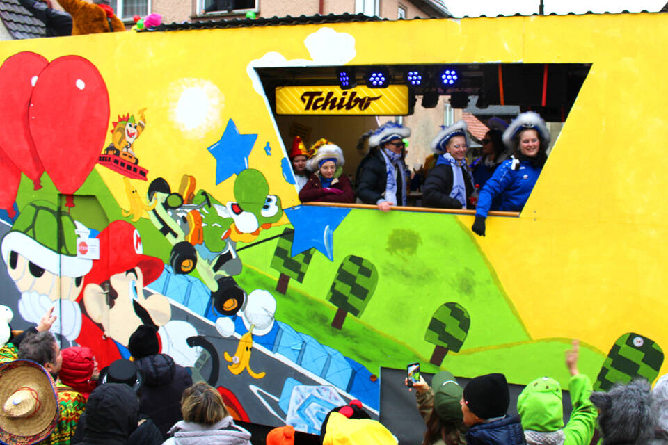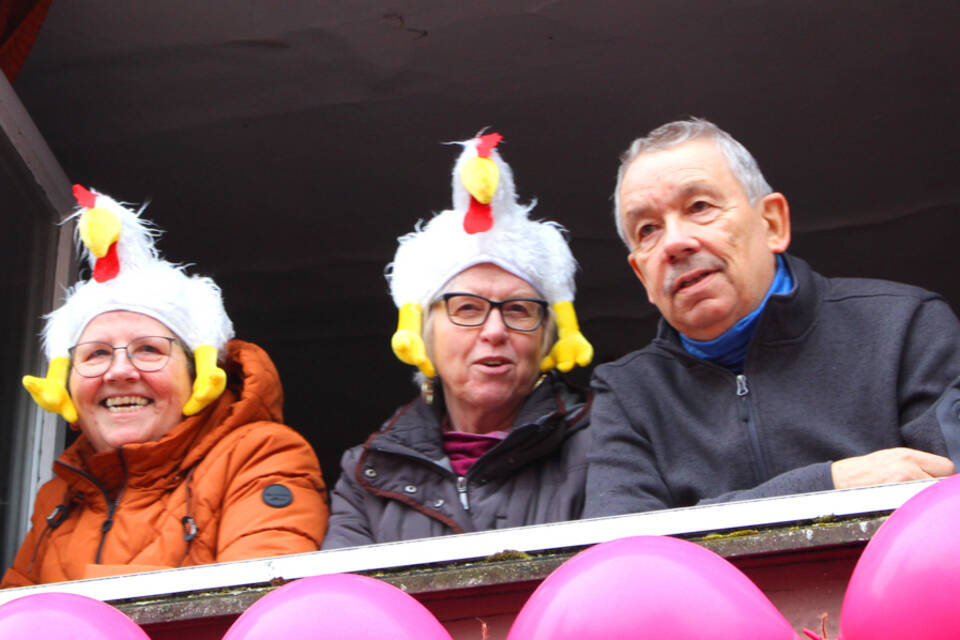 Das Schweinberger Prinzenpaar Carina Stang und Martin Gress hatten auf ihrem Wagen für alle Zuschauer am Wegesrand eine passende kleine Aufmerksamkeit. Foto: Janek Mayer