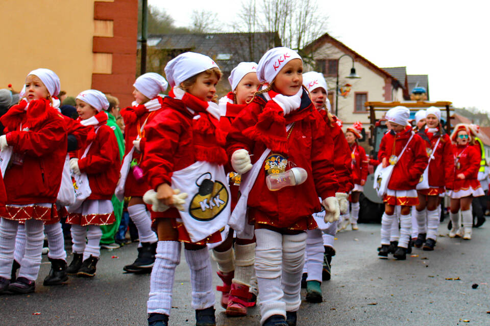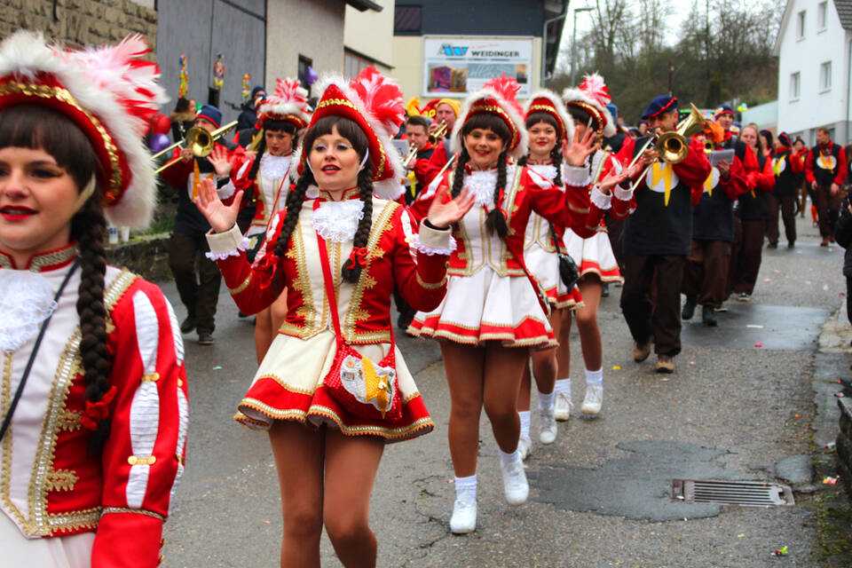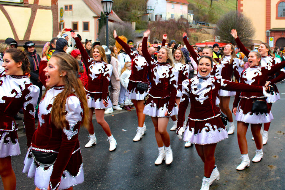 Elferrat und Prinzengarde wagten gemeinsam ein flottes Tänzchen auf der Hauptstraße – sehr zur Freude des Publikums, das kräftig mitklatschte. Foto: Janek Mayer