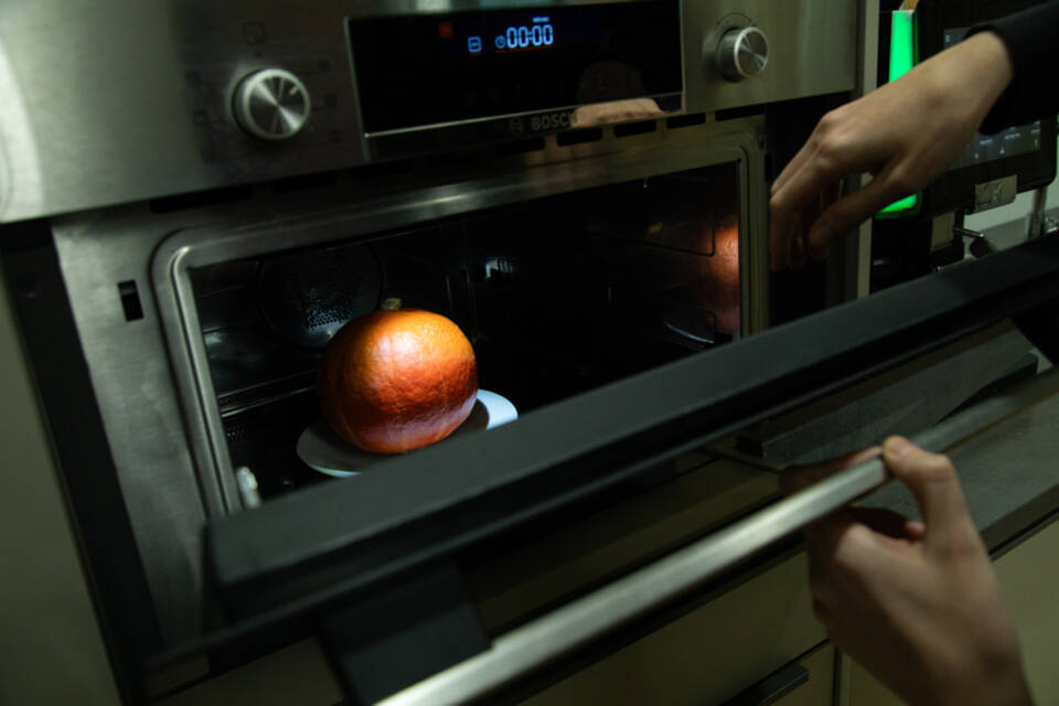 Für zweieinhalb Minuten bleibt der Kürbis bei höchster Stufe in der Mikrowelle. Foto: Christin Klose/dpa-tmn
