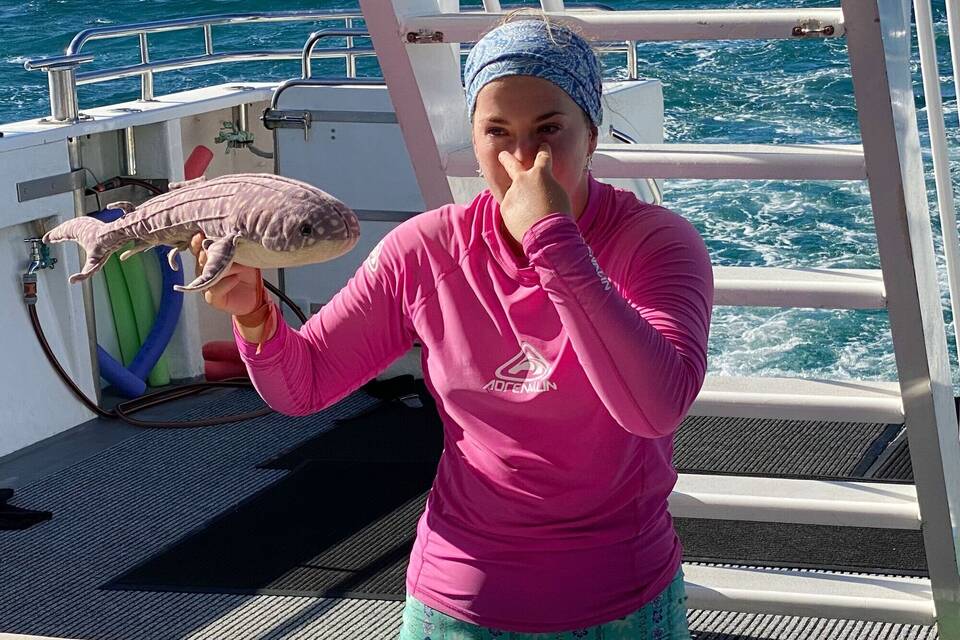 Immer die Augen auf: Anhand eines Stofftier-Walhais erläutert Georgia Clements die Verhaltensregeln beim Tauchen mit Walhaien. Foto: dpa
