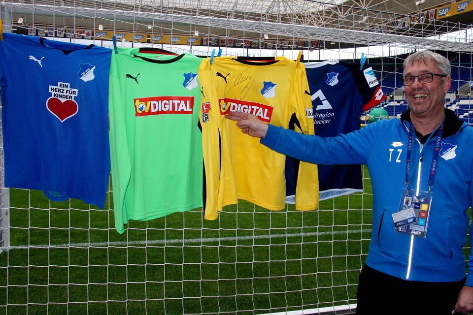 Die Leibchen mit dem TSG-Wappen sind natürlich ein Muss für den Trikotsammler Thomas Zachler. Foto: Of