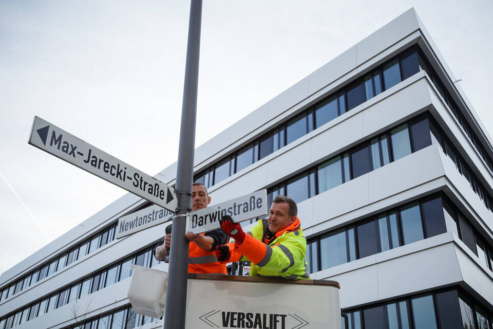 Raoul Schmidt-Lamontain begleitete die Schlosserei. In einem Hubsteiger brachte er neue Straßenschilder in der Bahnstadt an.