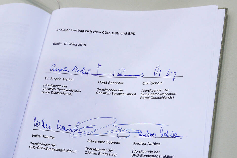 Die neun Unterschriften zeugen davon: Der Koalitionsvertrag ist nun unter Dach und Fach. Foto: dpa