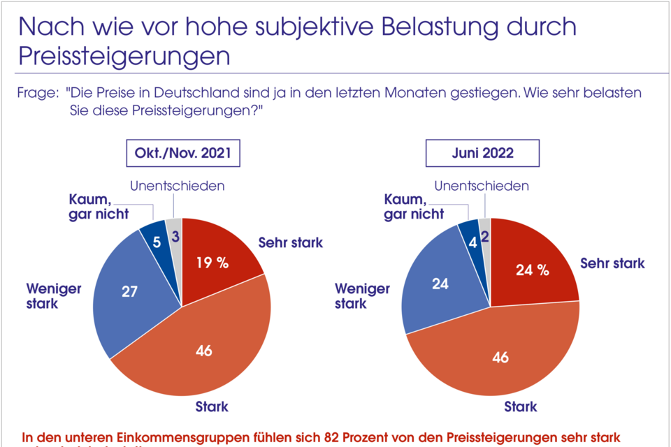 > Spürbarer Preisanstieg: Nach einer ersten Schätzung des Statischen Bundesamtes lagen die Verbraucherpreise im Juni um 7,6 Prozent über dem Niveau des Vorjahresmonats – und im Alltag merken die Befragten, dass sie durch Preissteigerungen belastet werden. Als besonders belastend empfindet die Bevölkerung die Preissteigerungen für Benzin, Strom, Lebensmittel und Heizen. 70 Prozent fühlen sich durch die steigenden Preise sehr stark oder stark belastet. Jeder Vierte empfindet die Preissteigerungen sogar als besonders gravierend.