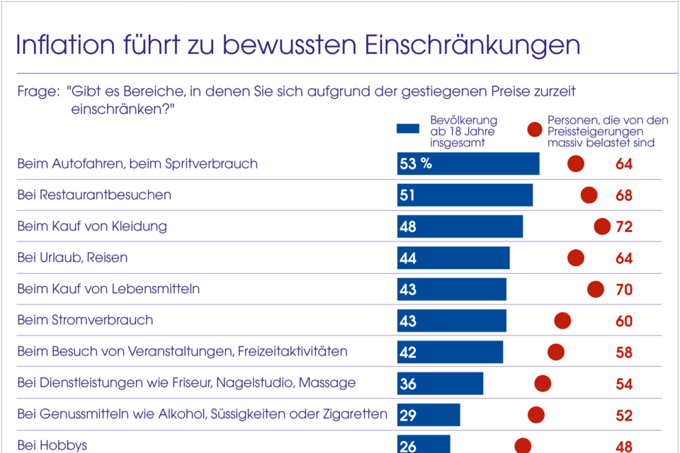 > Menschen sparen mehr: Teilweise müssen die Verbraucher den Gürtel daher enger schnallen. Ein Großteil versucht, sparsamer zu sein. 53 Prozent schränken sich derzeit beim Autofahren ein – und versuchen, Sprit zu sparen. Während 51 Prozent weniger Essen gehen, setzen 48 Prozent beim Kauf von Kleidung den Rotstift an. Immerhin 44 Prozent sparen bei Urlaub und Reisen.