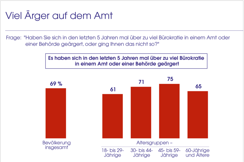 > Ärger auf dem Amt erlebt: Ihr Urteil über die Bürokratie beruht oft auf persönlichen Erfahrungen. So geben 69 Prozent der Menschen zu Protokoll, dass sie sich in den letzten fünf Jahren über zu viel Bürokratie in einem Amt oder einer Behörde geärgert haben.